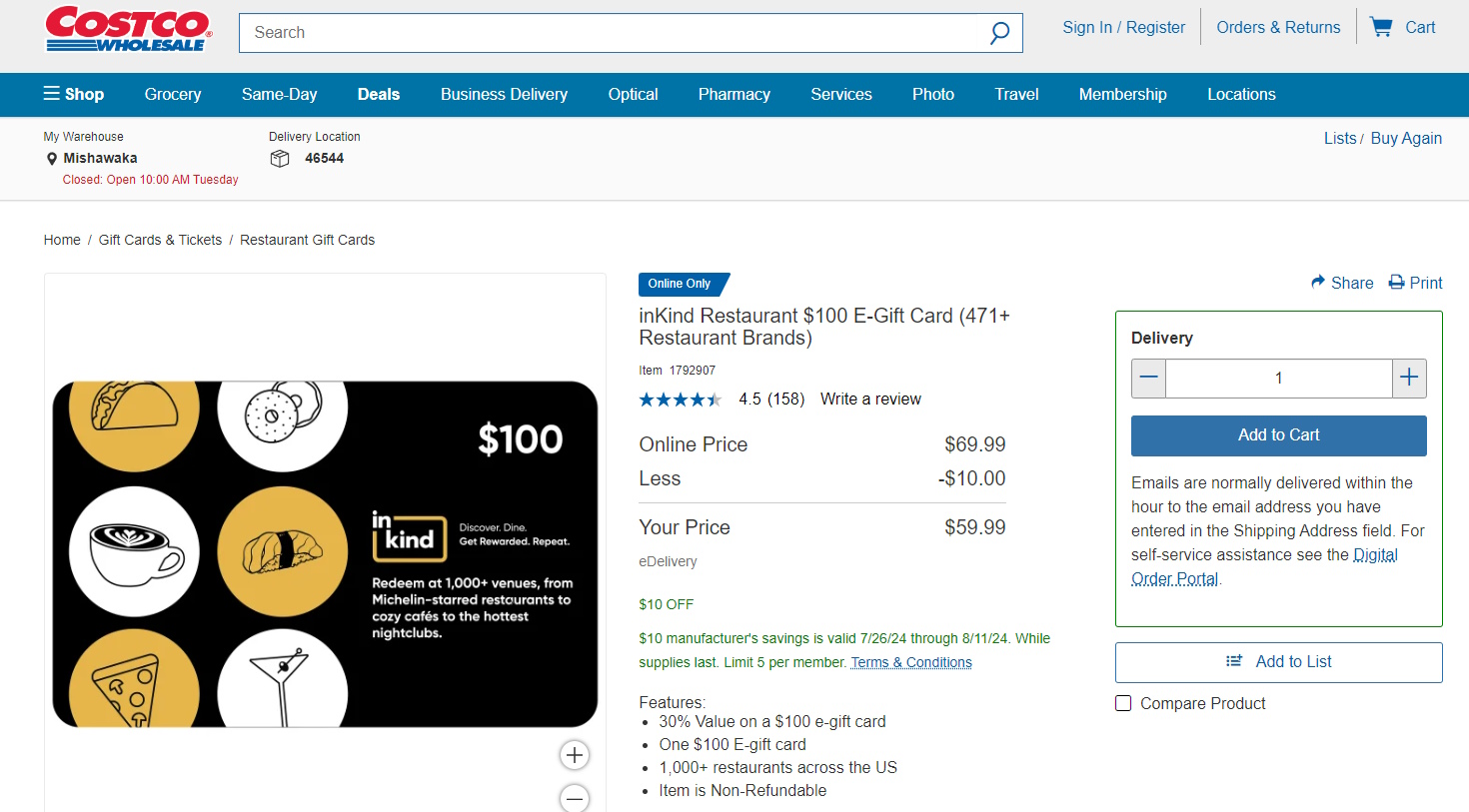 I am a big fan of INKIND (use this link to get $25 off when you spend $50) and have used them all over the place for great savings. Well, right now, Costco is offering a sweet discount on a $100 dining credit from INKIND.