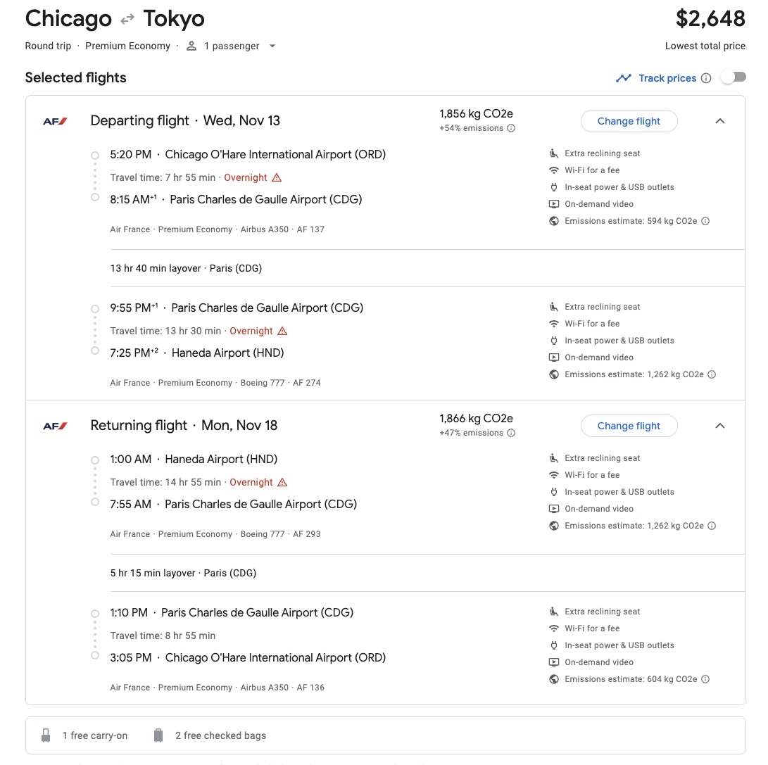 This trip departs Chicago on Wednesday evening, November 13, (but play around with the dates using this Google Flights link) and connects in Paris (CDG) the next morning. Here’s the thing: you have over 13 hours before your 9:55 PM flight departs for Tokyo. That gives you plenty of time to head into Paris and do some sightseeing. (There are luggage storage lockers at CDG.) Or if you could get a room at the Sheraton inside CDG. (I’ve stayed there and it’s a great hotel.) You get to Tokyo on Friday evening at 7:25 PM.