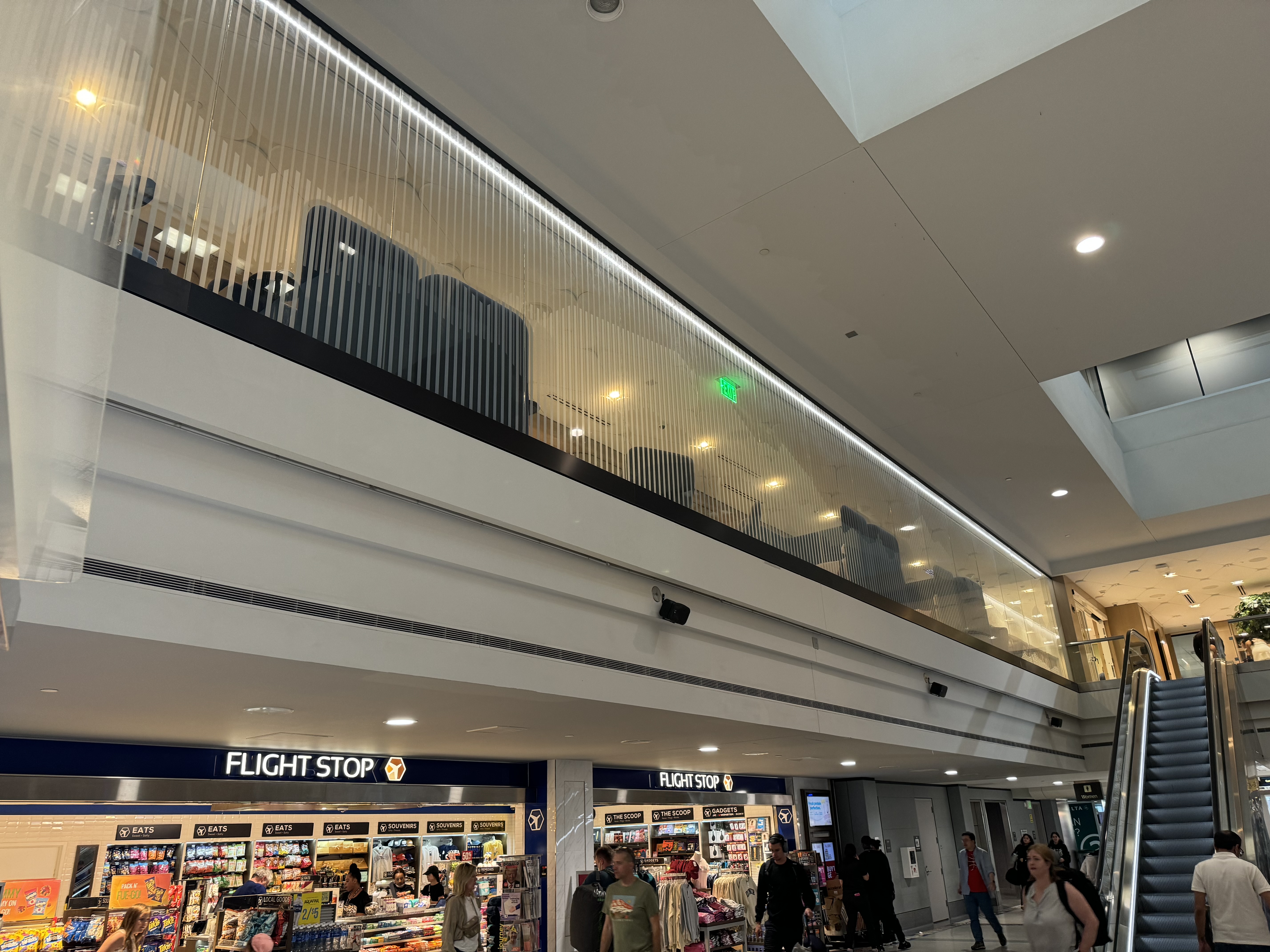 A Flight Stop shop is on one side of the escalators.