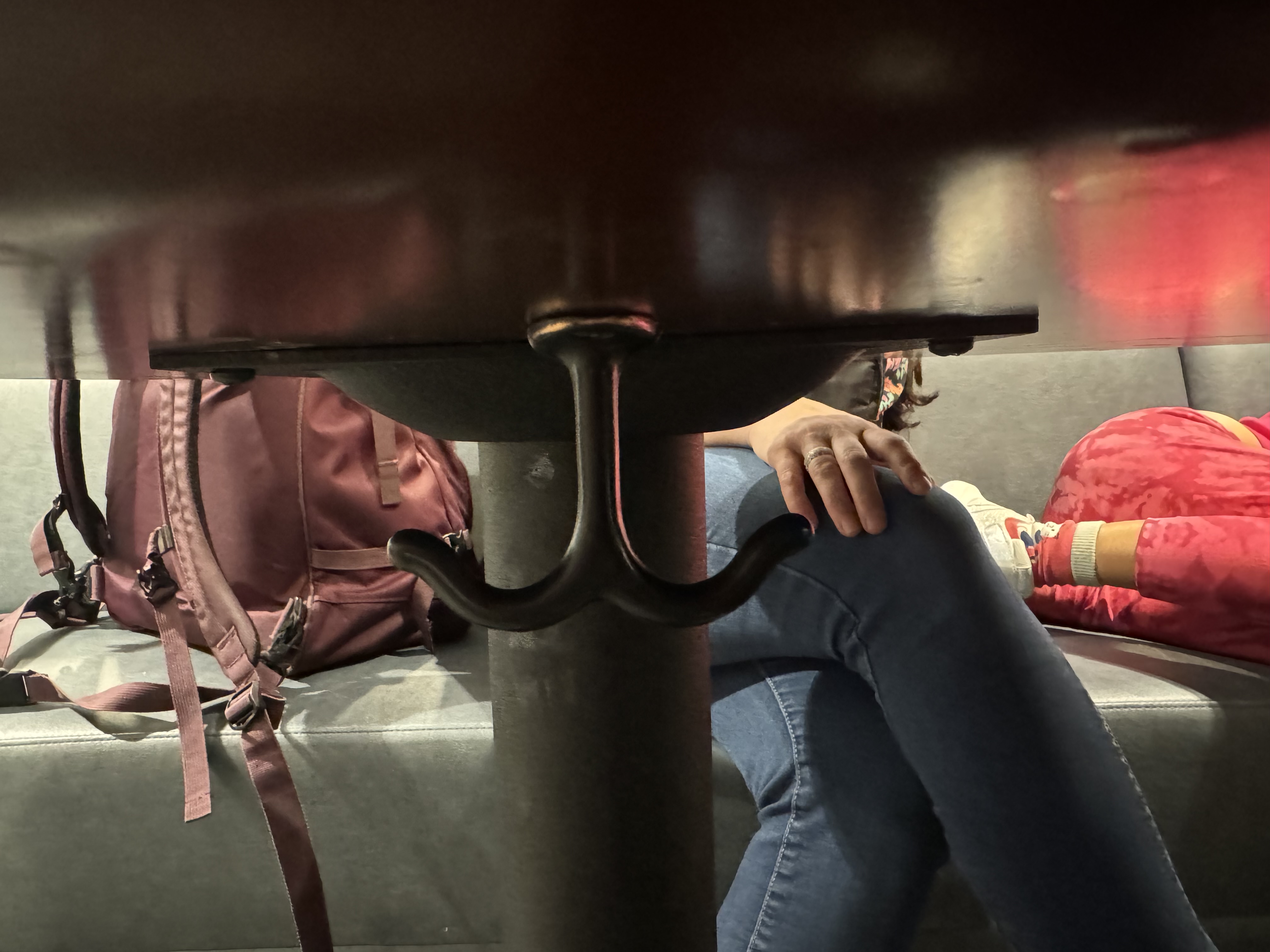 There are hooks under some tables so you can hang a bag.