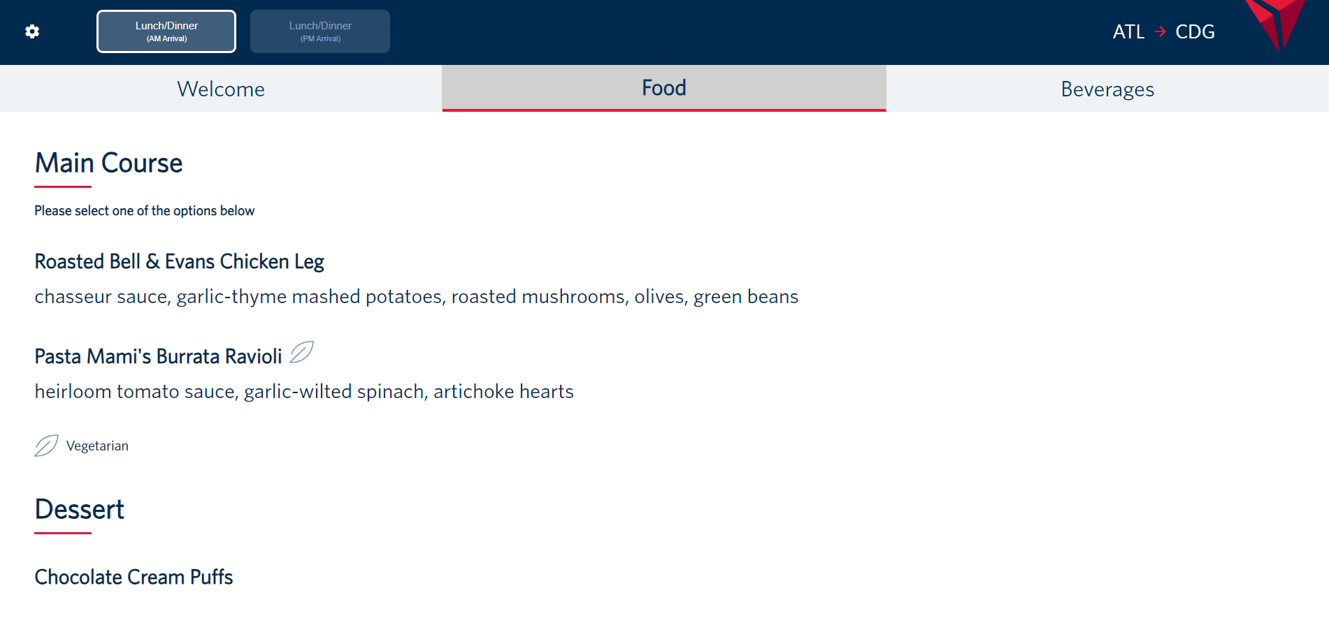 Currently (as of this posting) Delta is offering an upgraded Premium Select menu but not as elevated as the cabin in front. Delta also allows you to select your meal, in either cabin, starting 7 days before your flight, the cutoff to make a choice is 24 hours before flight. But if you are curious about the meal choices that will be offered farther out, Delta does have a website you can visit to get a basic overall view of what to expect.