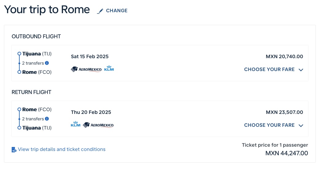 You’ll purchase this SkyTeam business class trip from KLM’s Mexican website and pay in Mexico pesos. Make sure to use a credit card that doesn’t charge foreign transaction fees. (Here are some examples.) We found a departure date of Saturday, February 15, 2025, with a Thursday, February 20 return. But use this Google Flights link to start the process and play around with the dates. I see some availability in January and February.