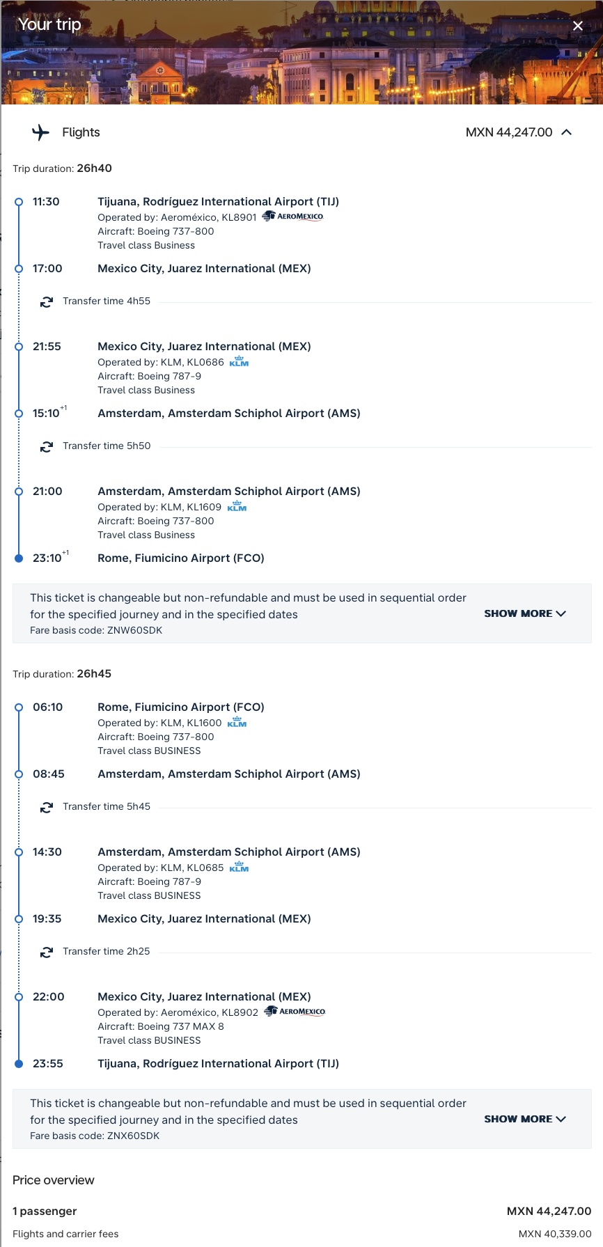 Worth keeping in mind: there might be schedule changes between now and next year that affect how many miles you fly. If anything, I think the only thing that would change is that KLM would rebook you from Mexico City to Rome on AeroMexico. If that were the case, you’d lose out on around $100 MQD. There’s also the chance your European hubs get switched a little (i.e., to Paris instead of Amsterdam). But I wouldn’t necessarily sweat all that.