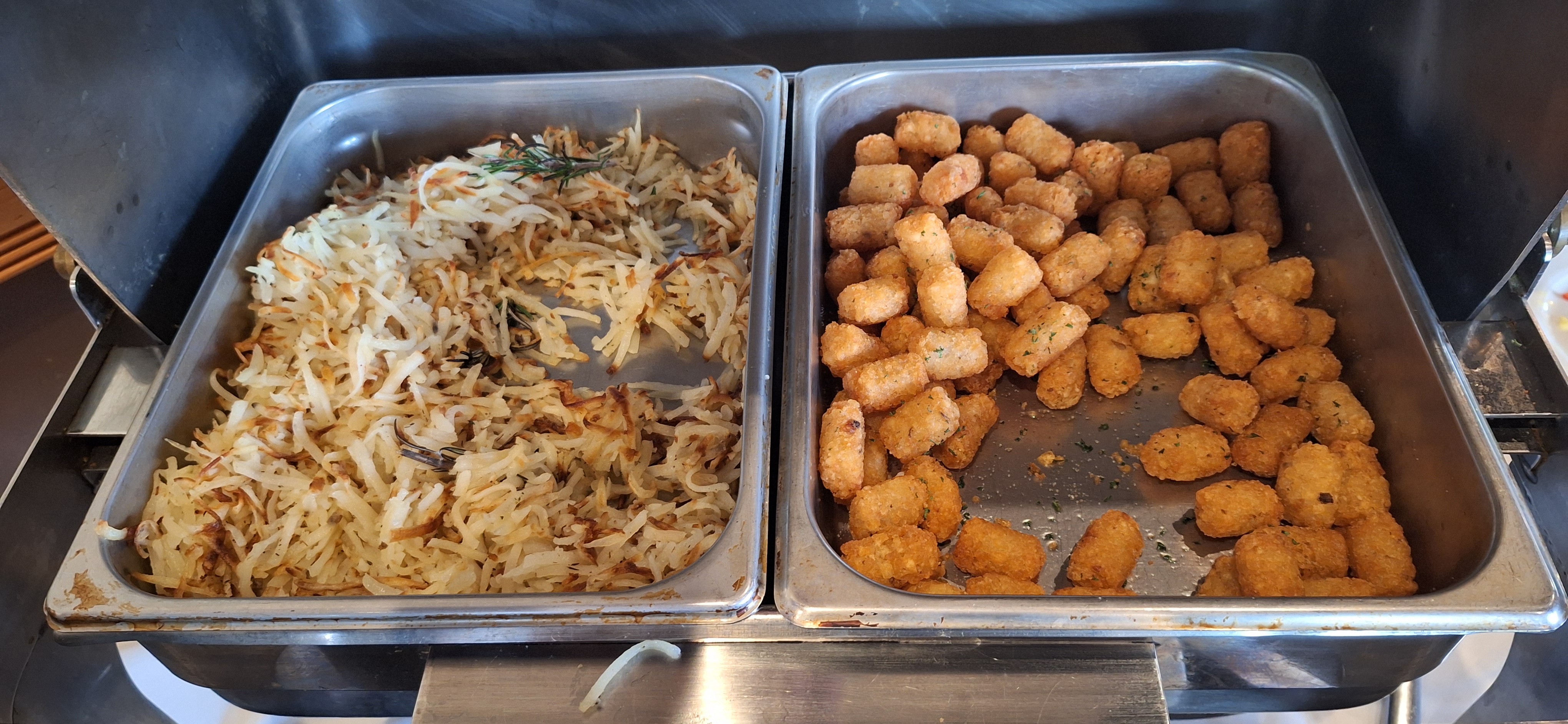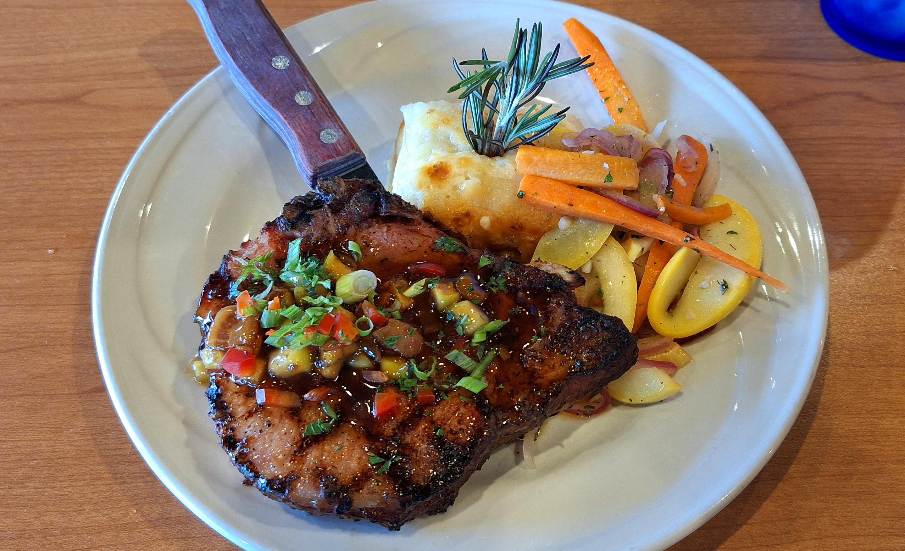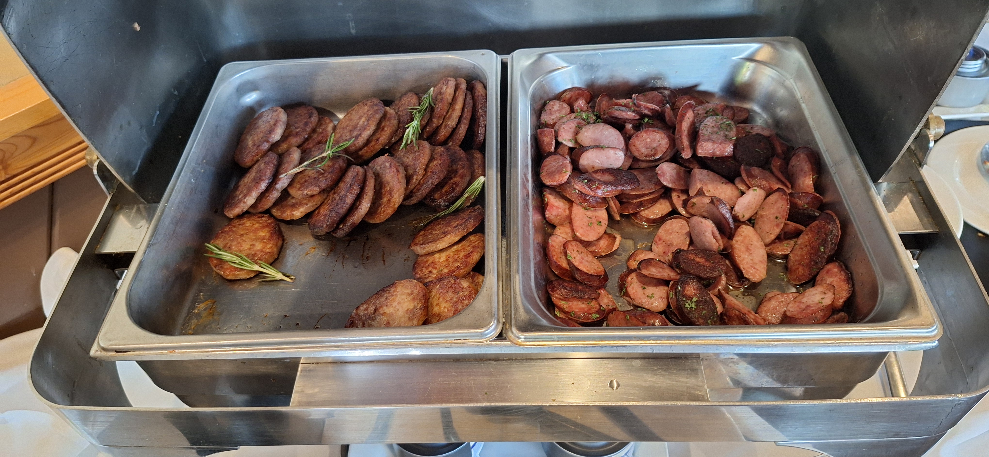 Above are two of the choices: a thick cut pork chop that was smashing and a strip steak that was lean and flavorful. Even the breakfast buffet was decent with fresh fruit each day and warmed plates. Take a look: