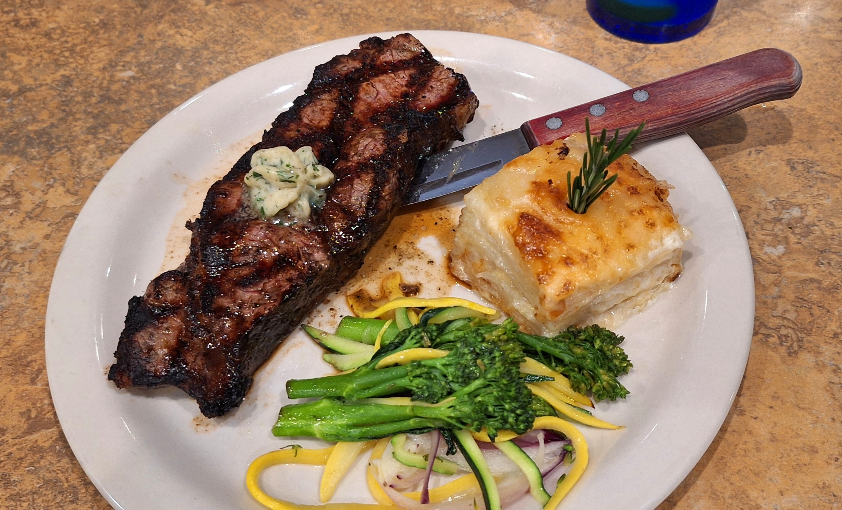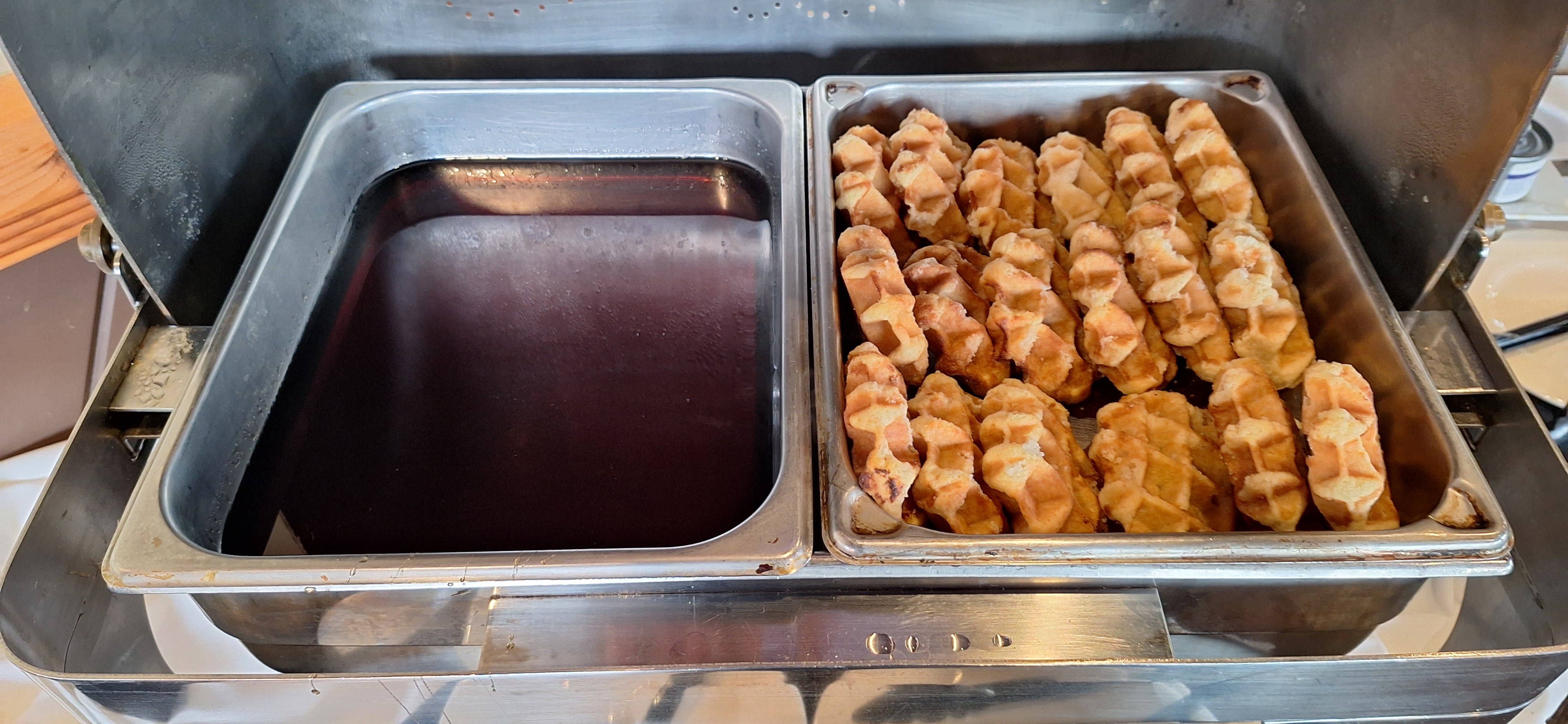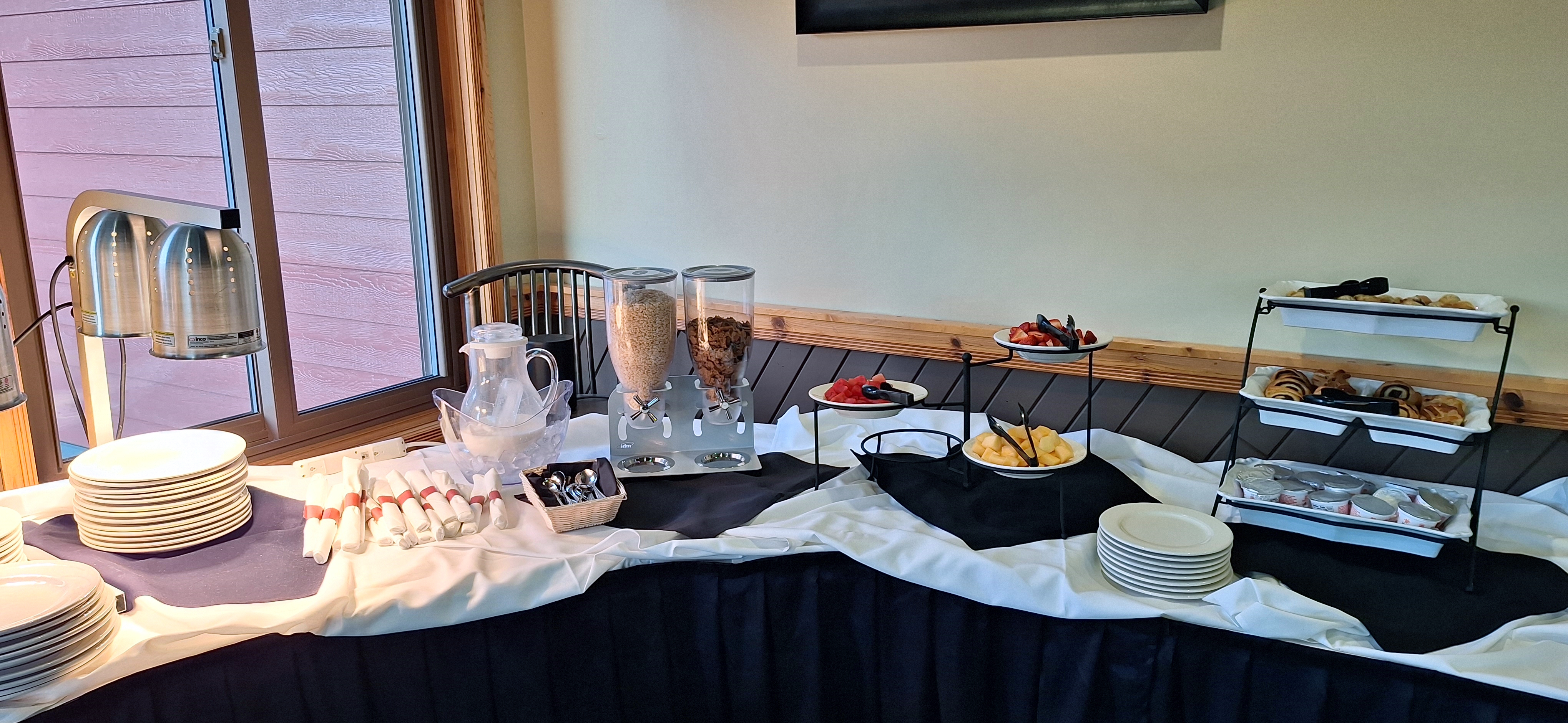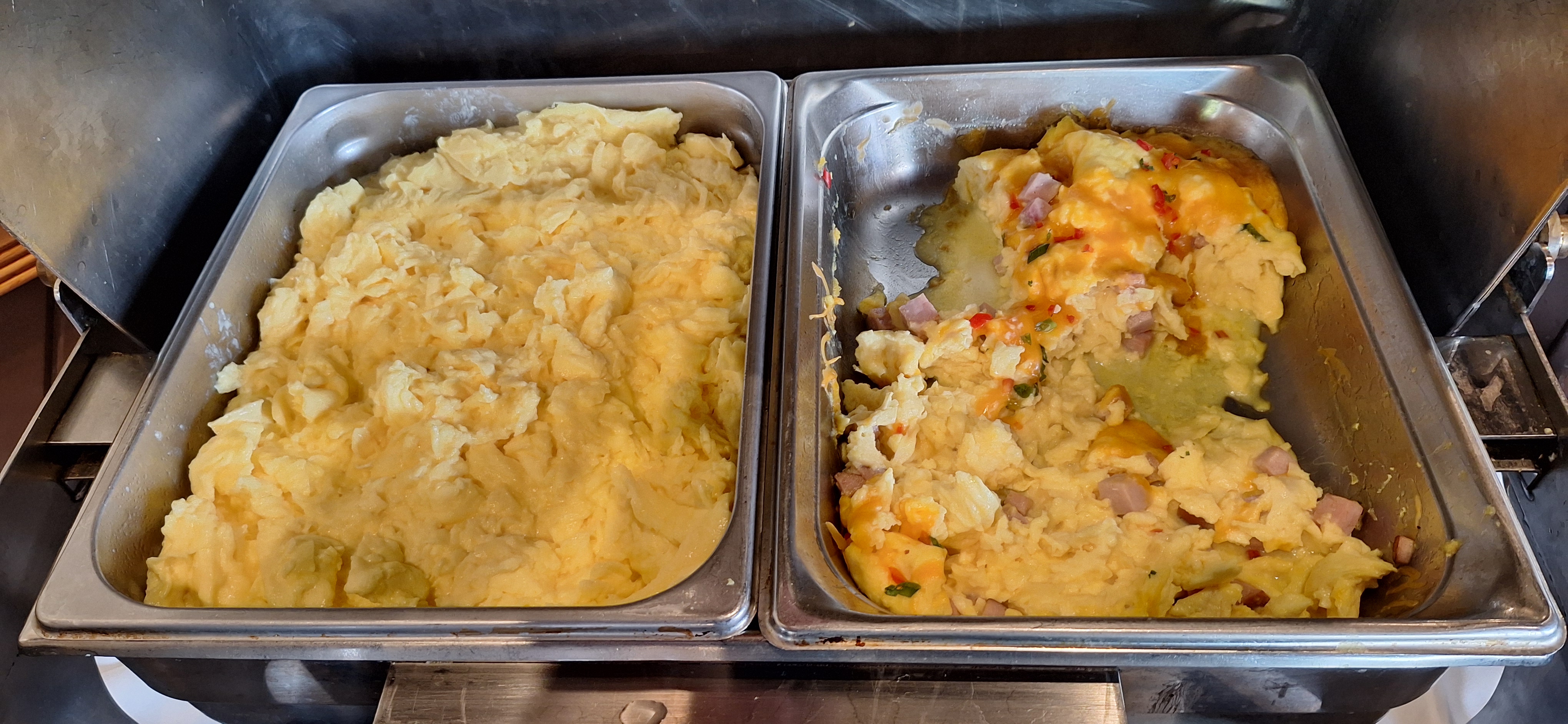 Above are two of the choices: a thick cut pork chop that was smashing and a strip steak that was lean and flavorful. Even the breakfast buffet was decent with fresh fruit each day and warmed plates. Take a look: