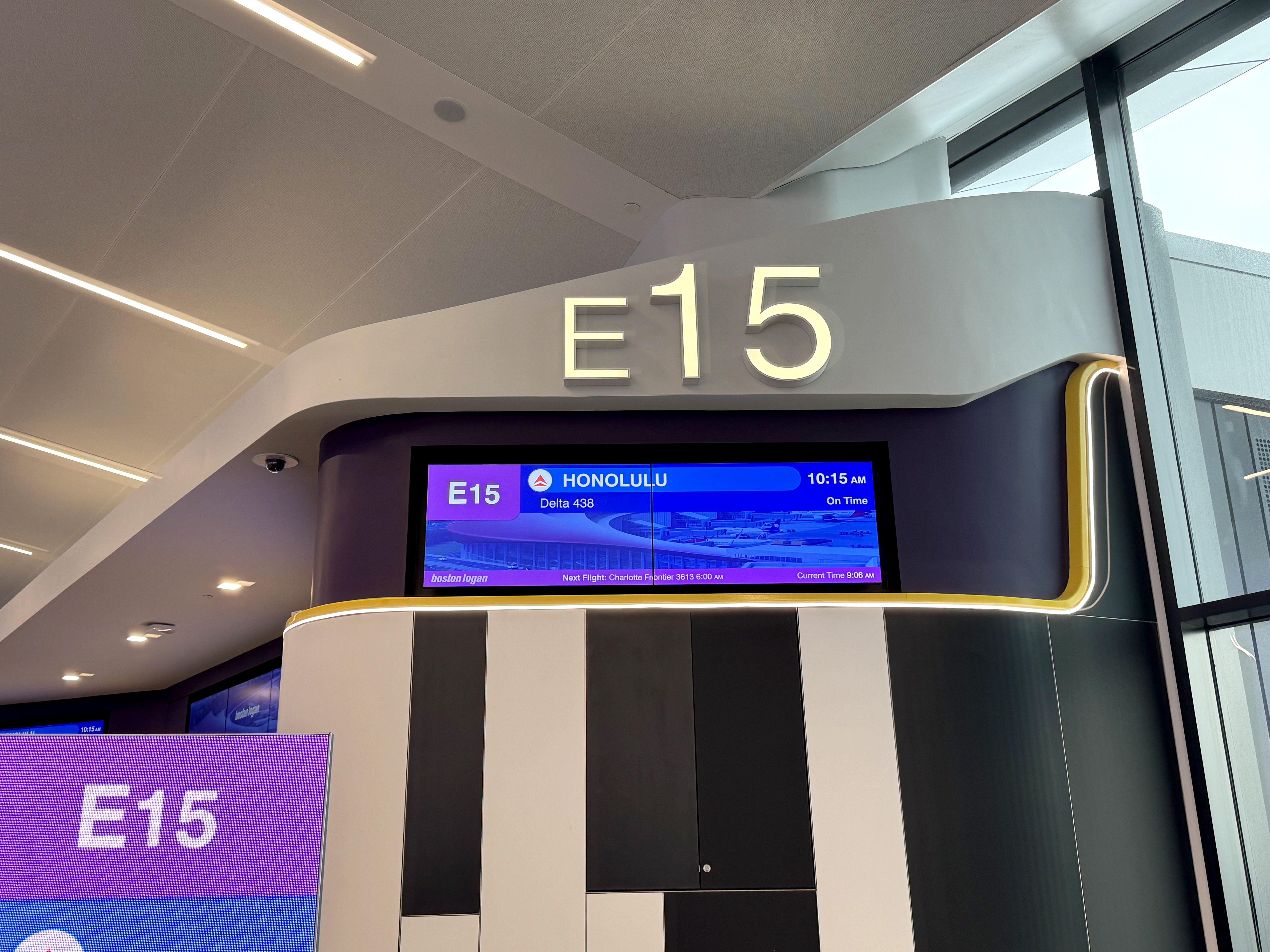 Delta flight DL438 to Honolulu boarded from Boston Logan gate E15 — waaaay at the end of Terminal E, where most widebody international flights depart. (Our post about the flight will explain how to get there.)