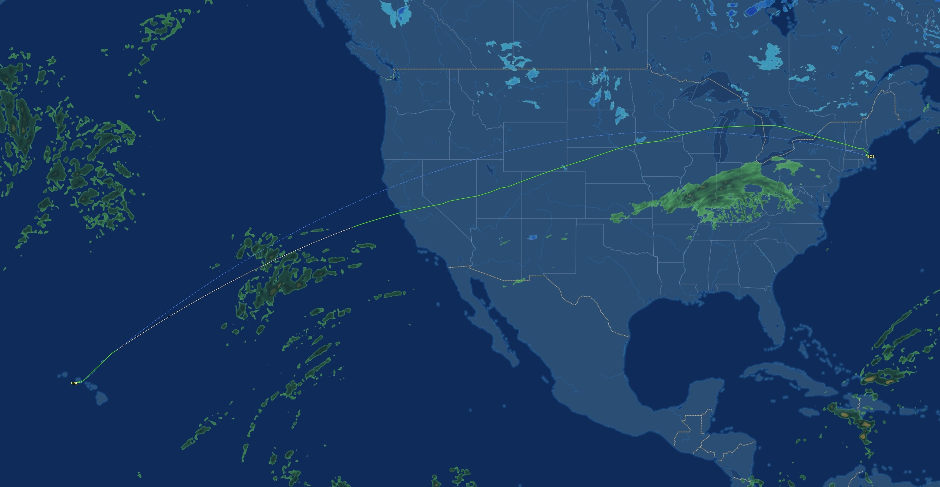 Less than a minute later, we were wheels up from a chilly, wet, gray Boston — and off to sunny, warm Honolulu! The flight time was estimated to be about 11 hours.