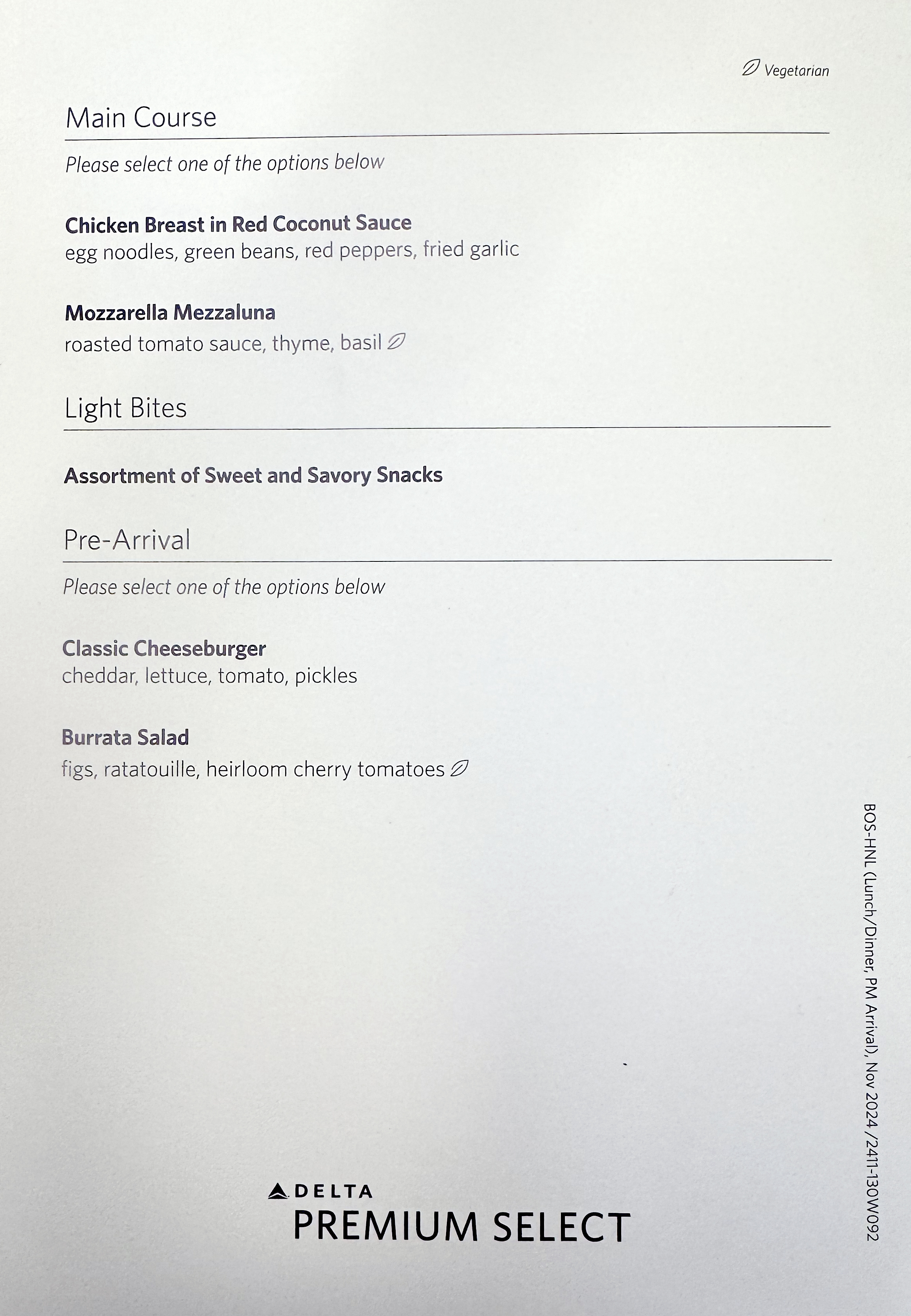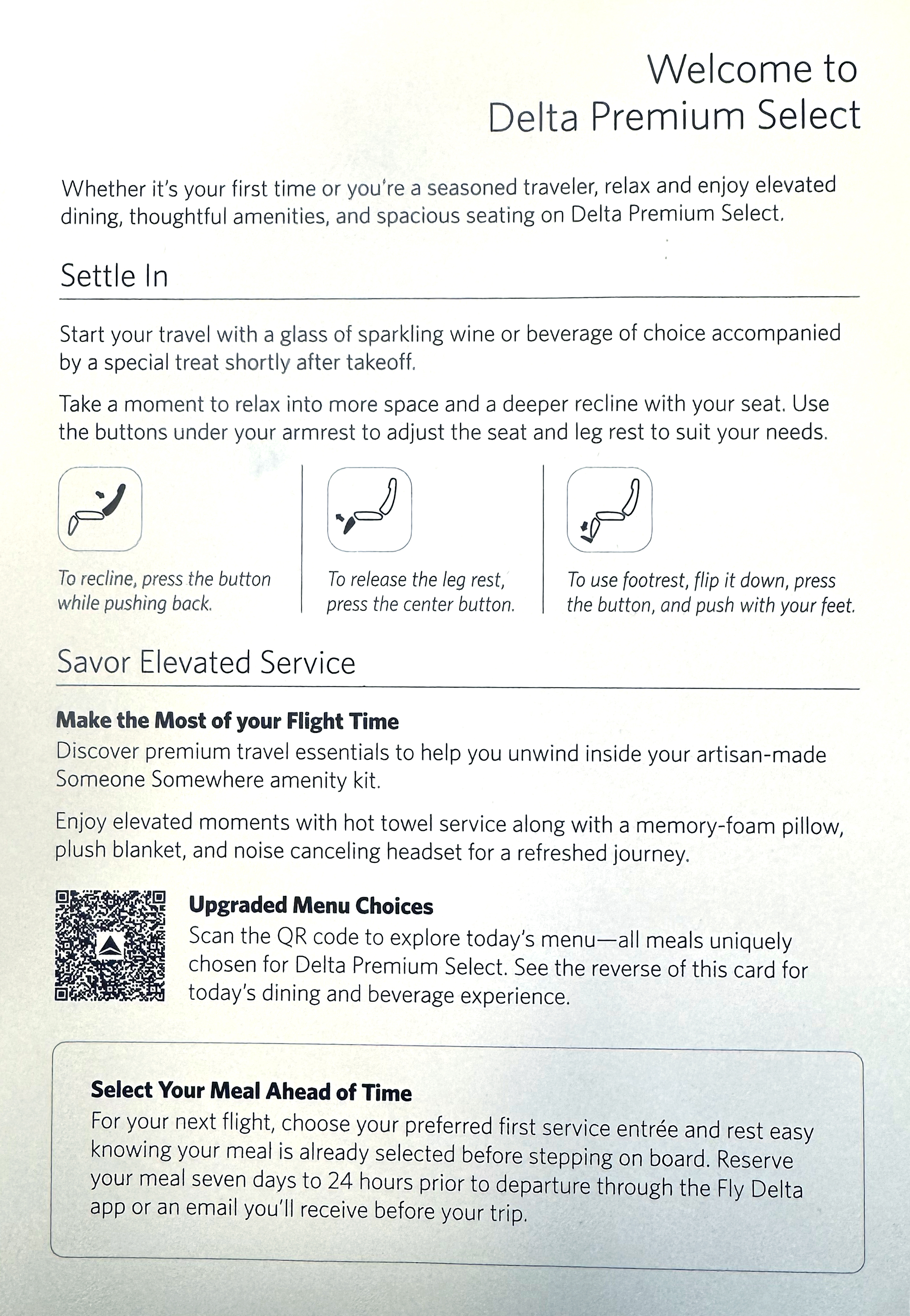 Our primary flight attendant was an awesome lady named Sherry. She gave us a Delta Premium Select welcome card. It explained our seats’ functions and also provided the flight’s menu.