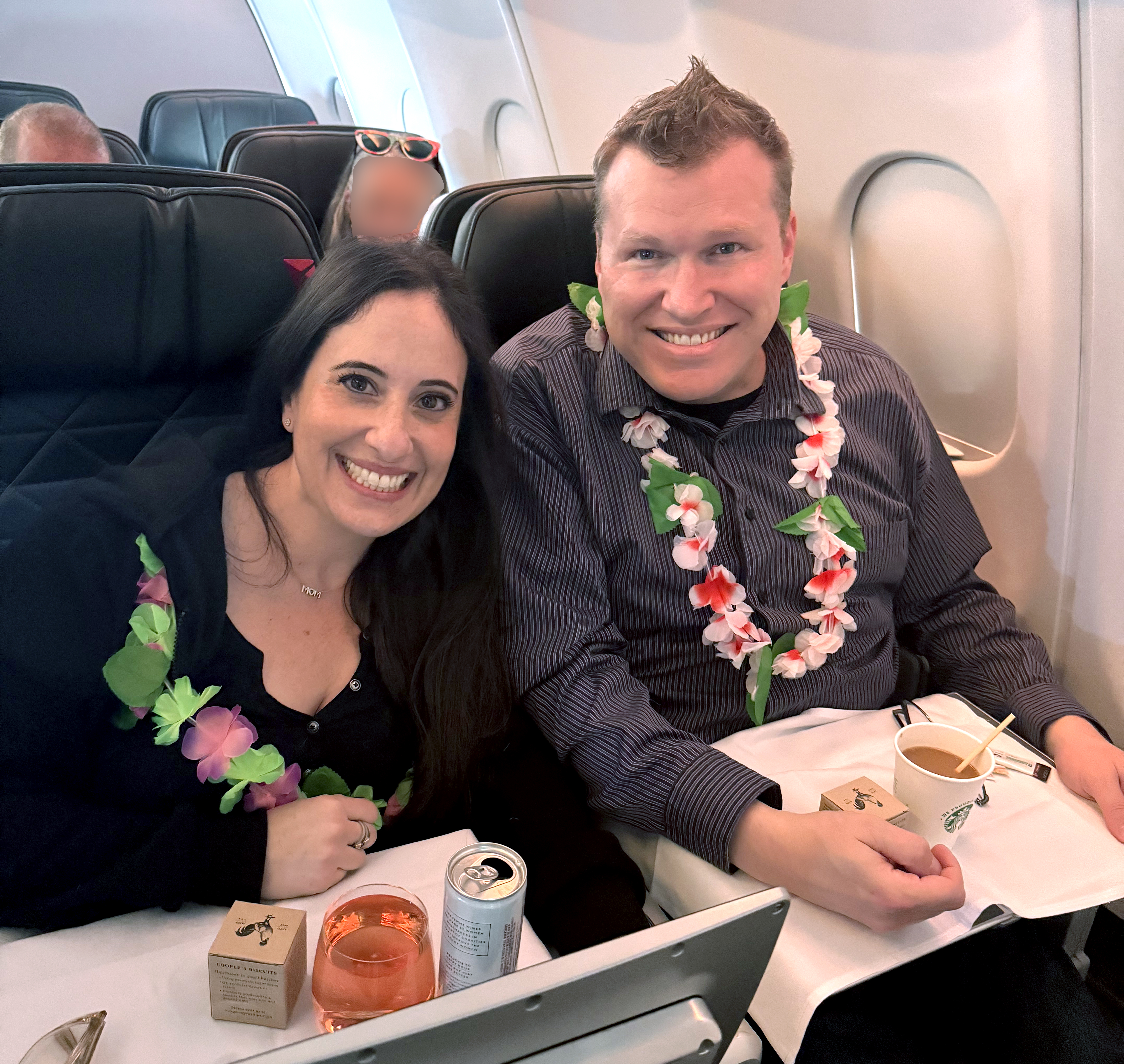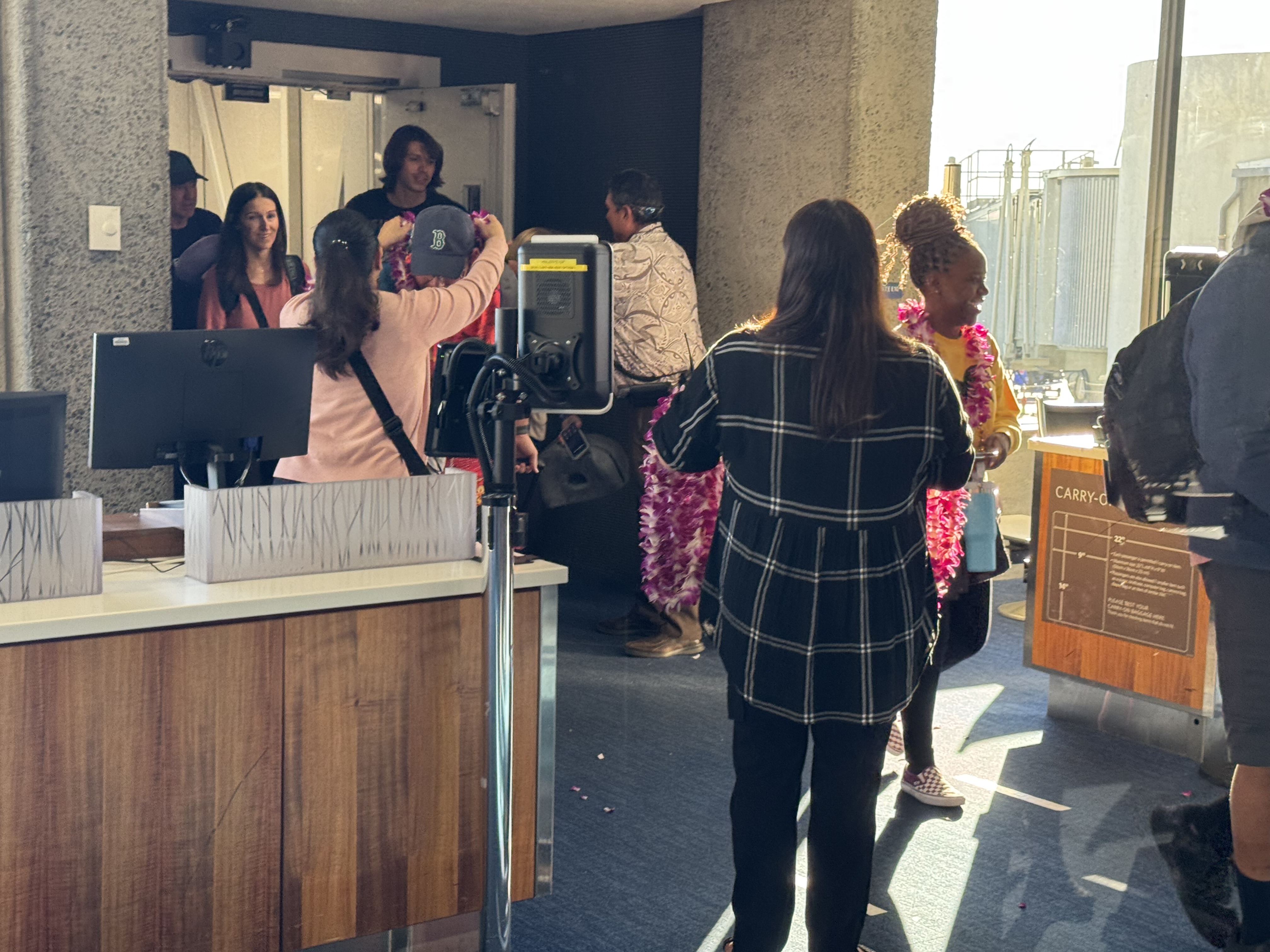 We received celebratory plastic leis during the pre-departure party in Boston. Just before deplaning, one of the flight attendants made an announcement that went something like this: