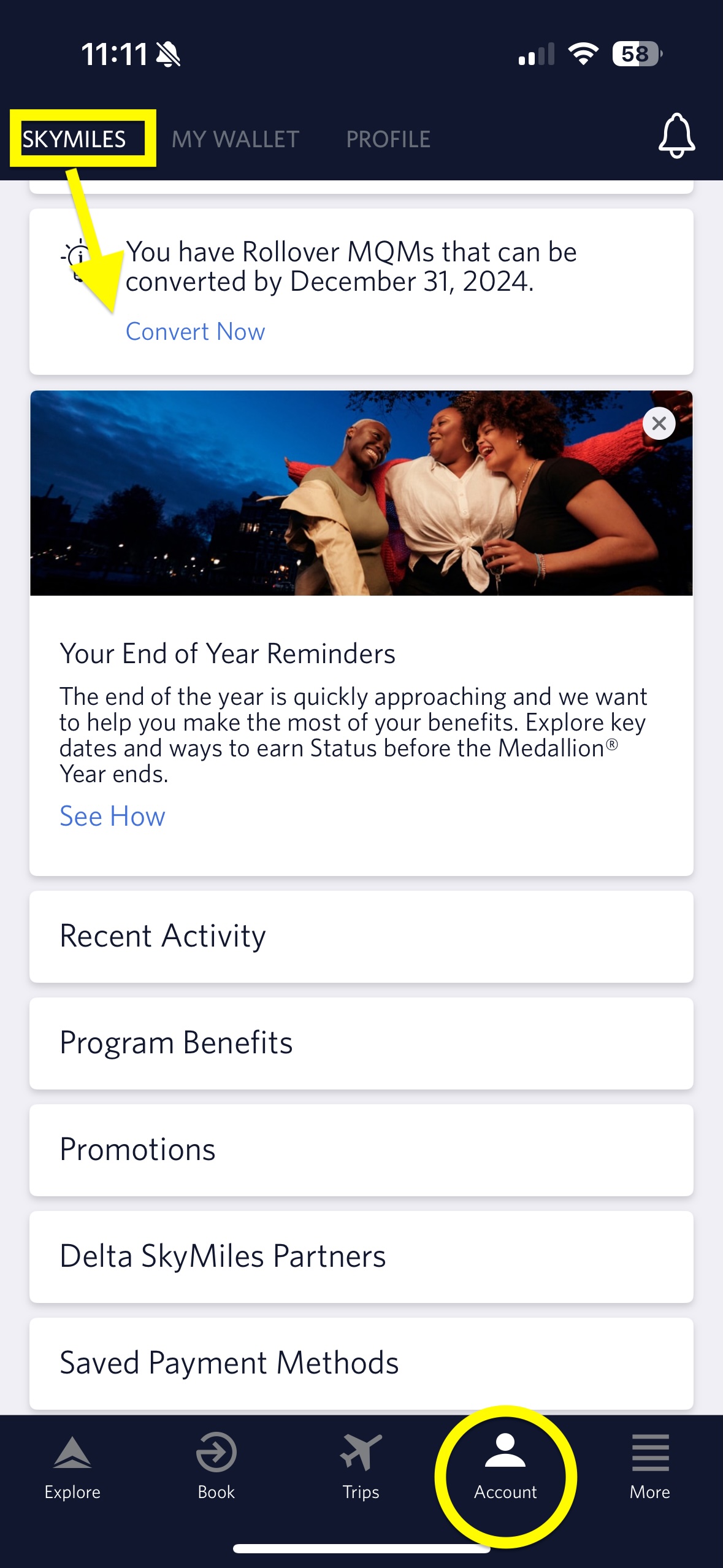 I’d go to the Fly Delta app. Select “Account” at the bottom of the screen, then tap “SKYMILES.” Scroll until you see “You have Rollover MQMs that can be converted by December 31, 2024.” Then tap “Convert Now.”