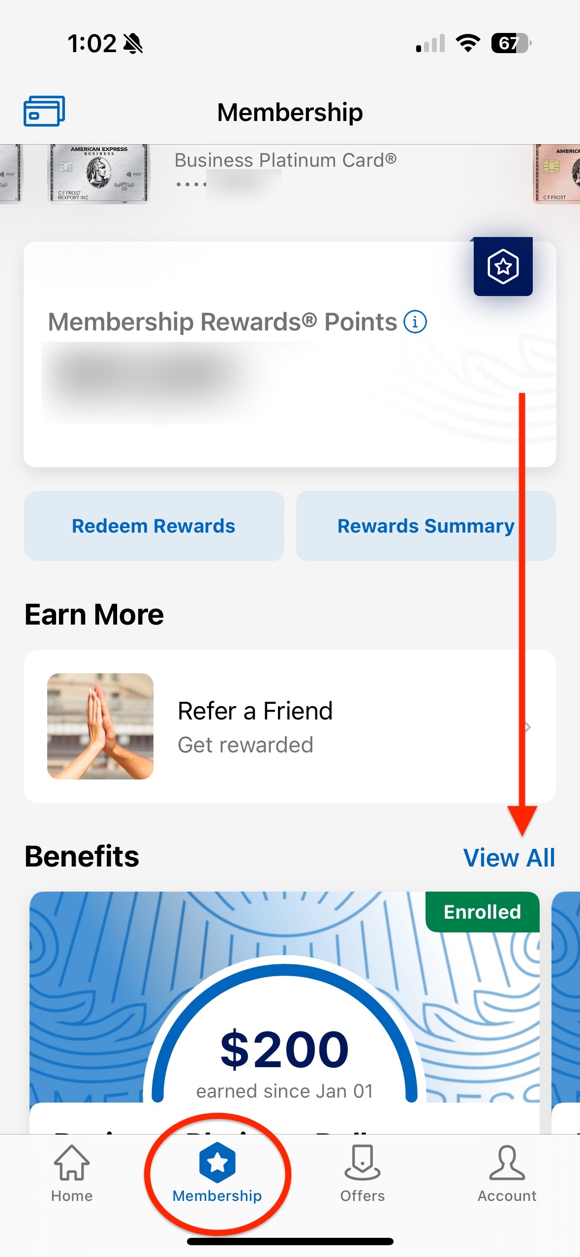 Go into your Amex app. Find your eligible card and make sure you’re on the “Membership” screen. Look for “Benefits,” then tap “View All.”