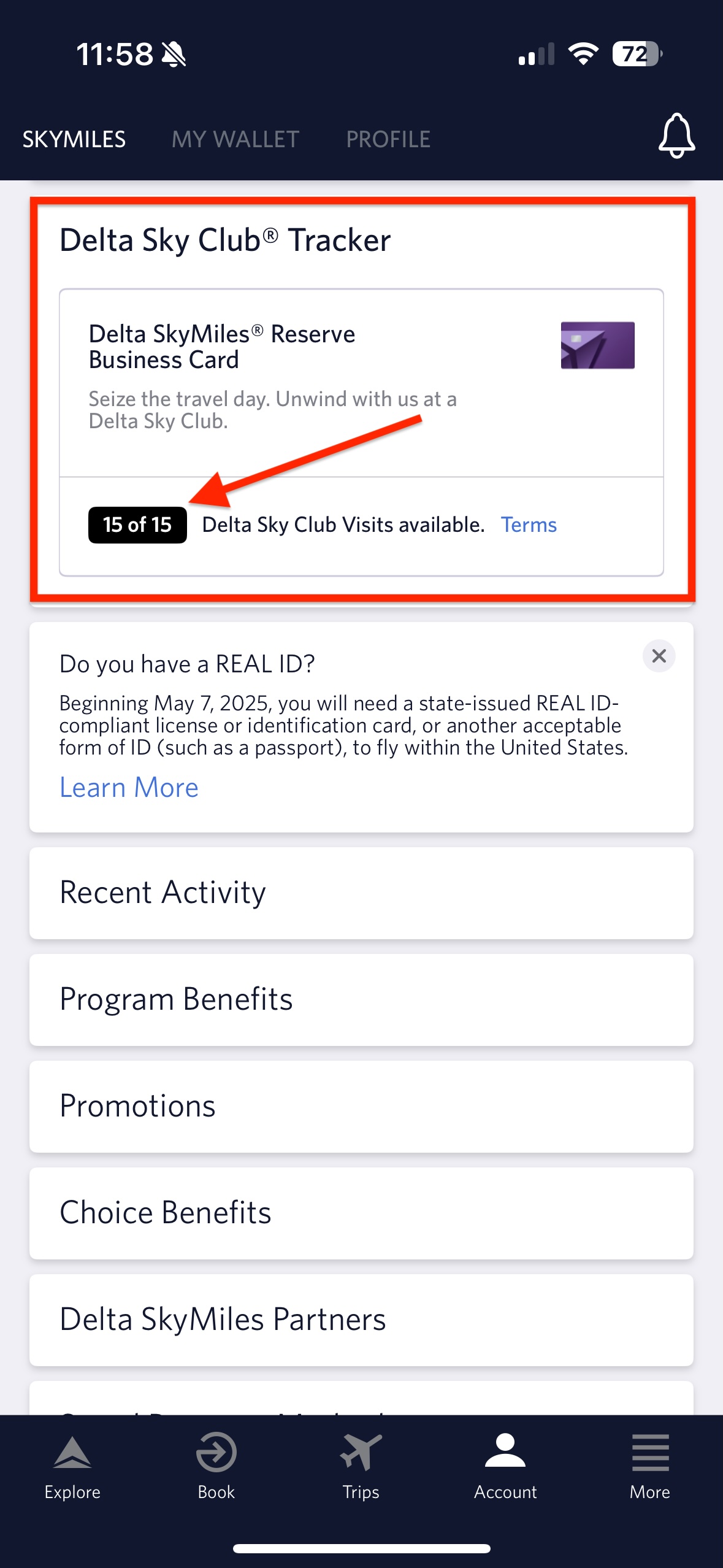 Go to the “SKYMILES” page in your Fly Delta app. Scroll down until you see “Delta Sky Club® Tracker. That shows you how many complimentary Sky Club visits you have left.