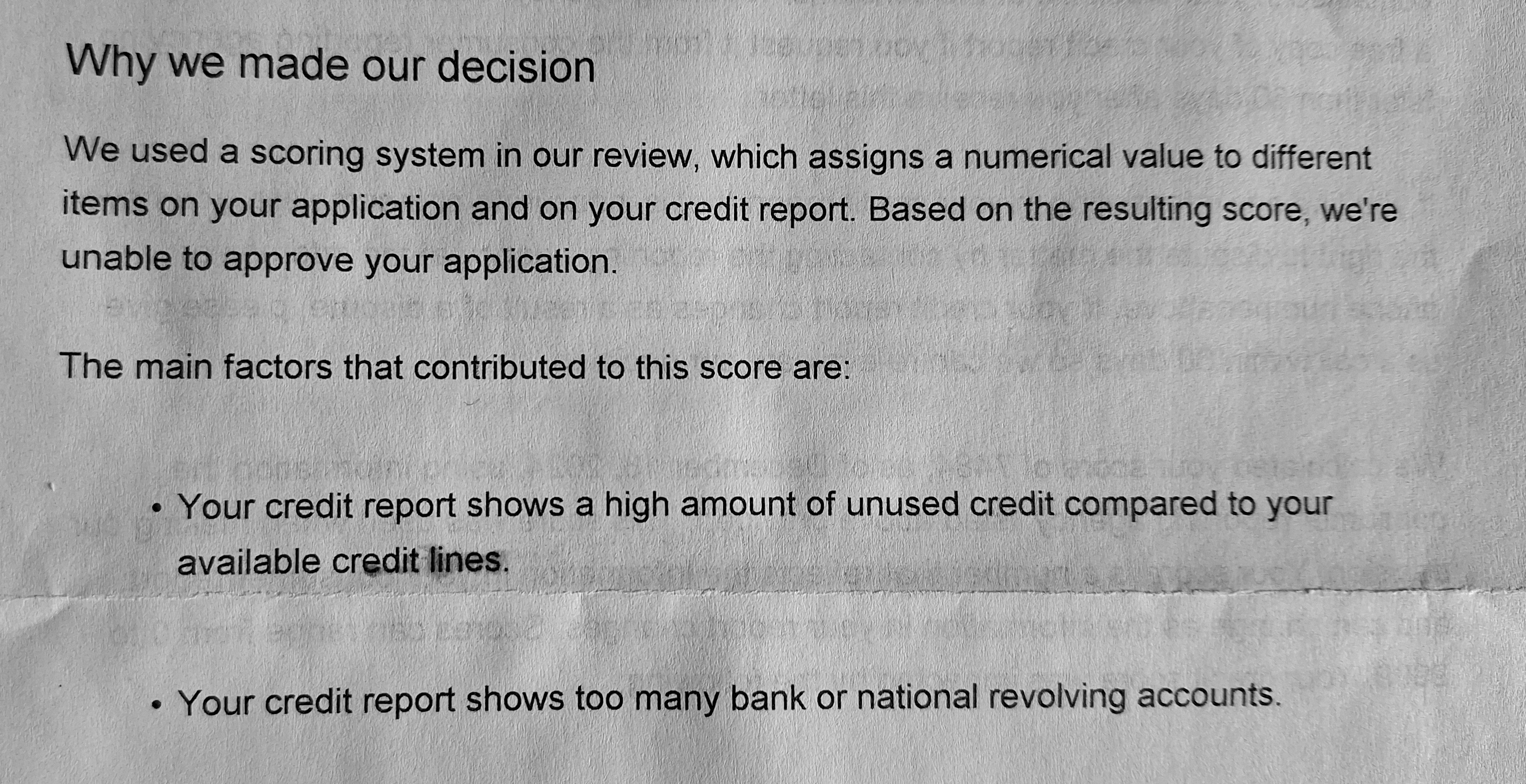 But during my most recent round of cards, I got one single denial and then in the mail got the following reason why I was turned down: