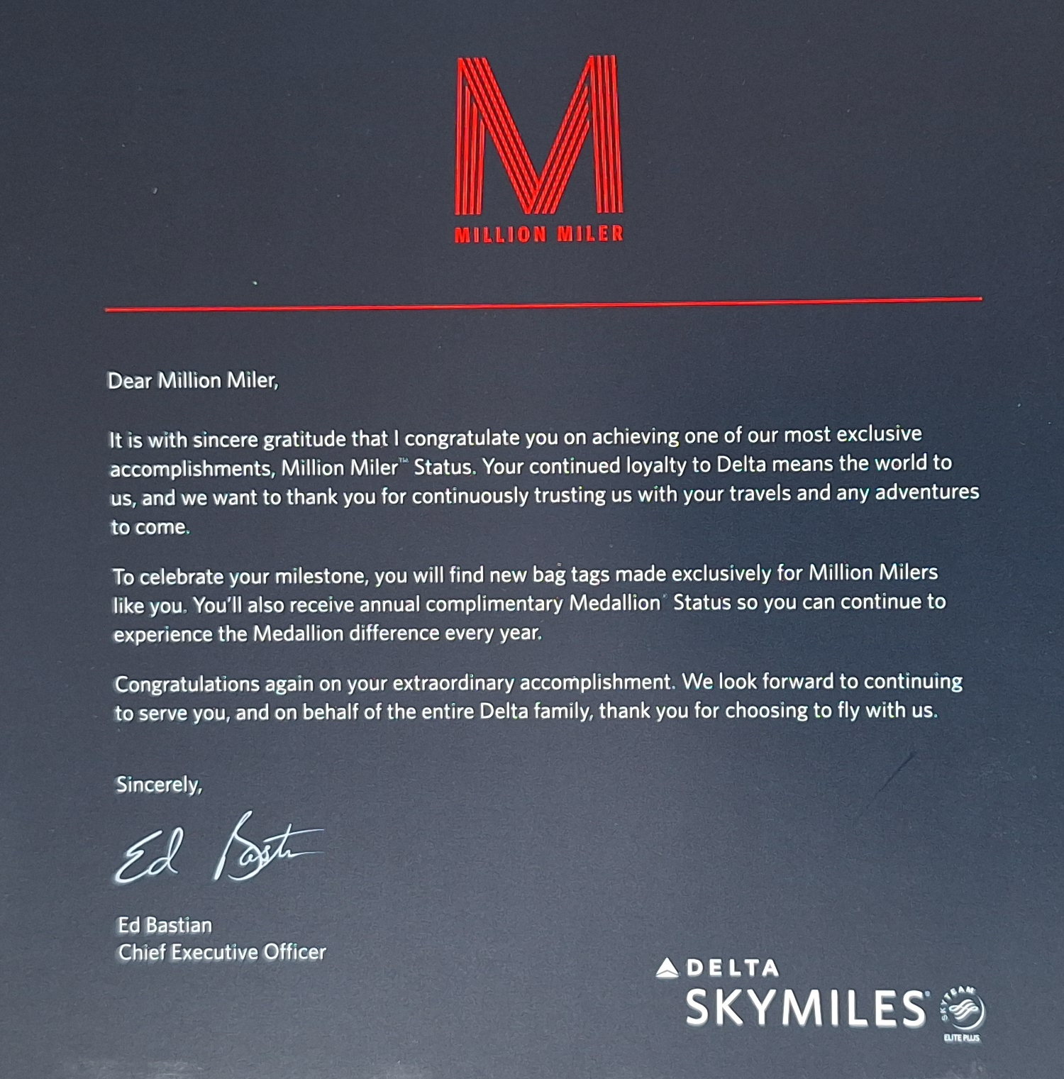 I opened it up to find a note from Mr. Ed (the Delta CEO) and two shiny new million miler luggage tags.