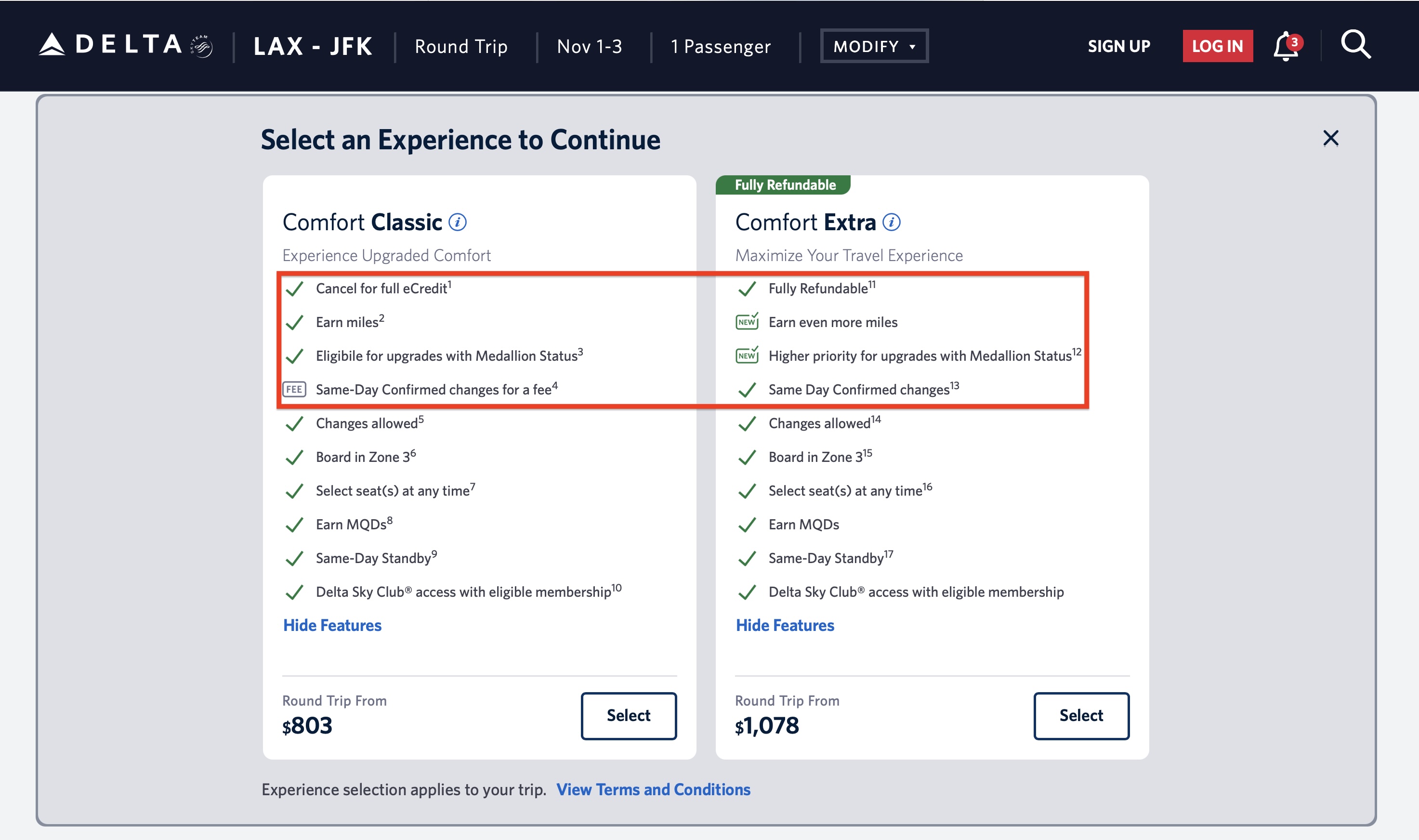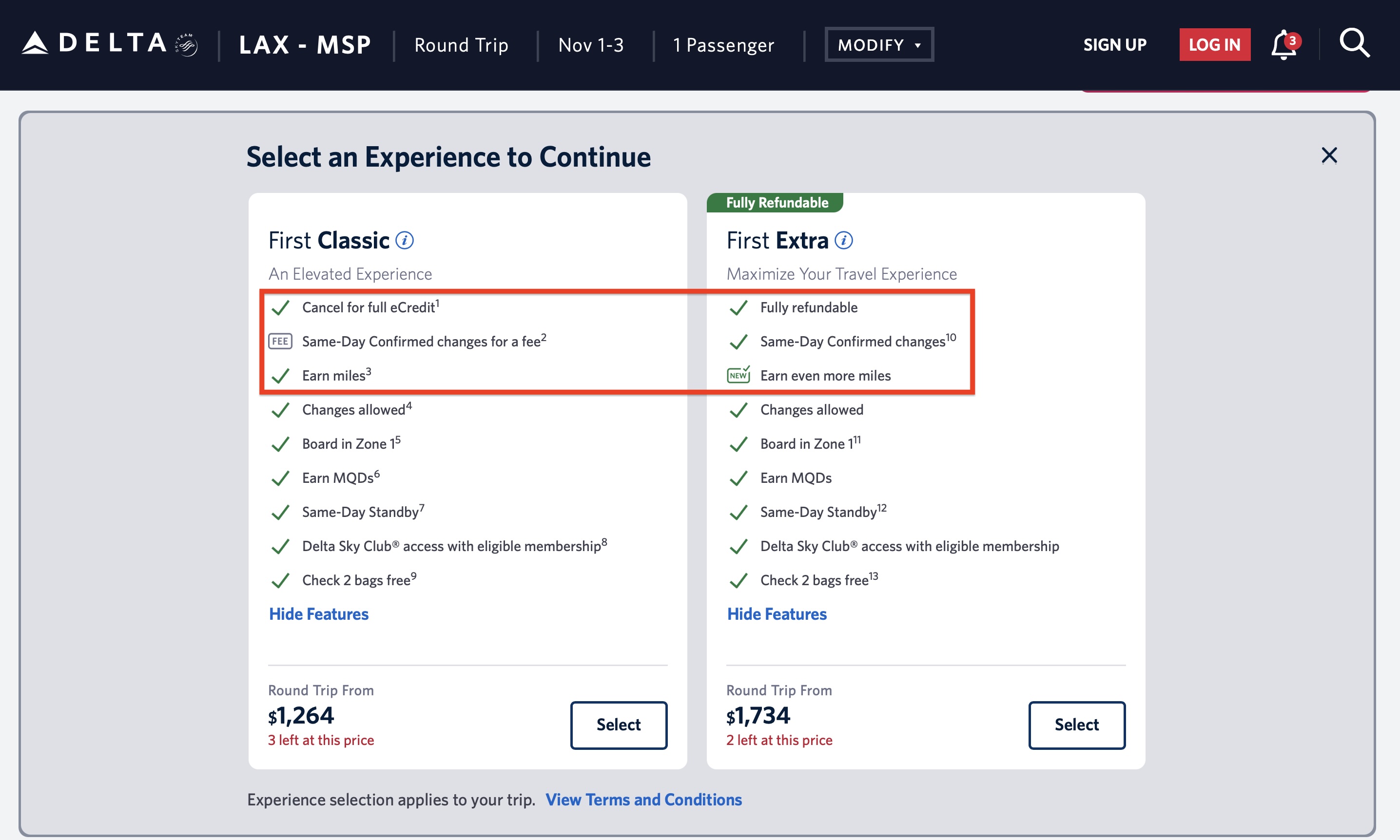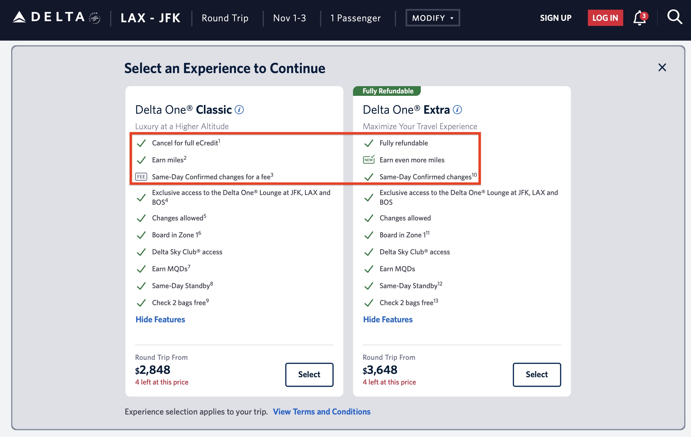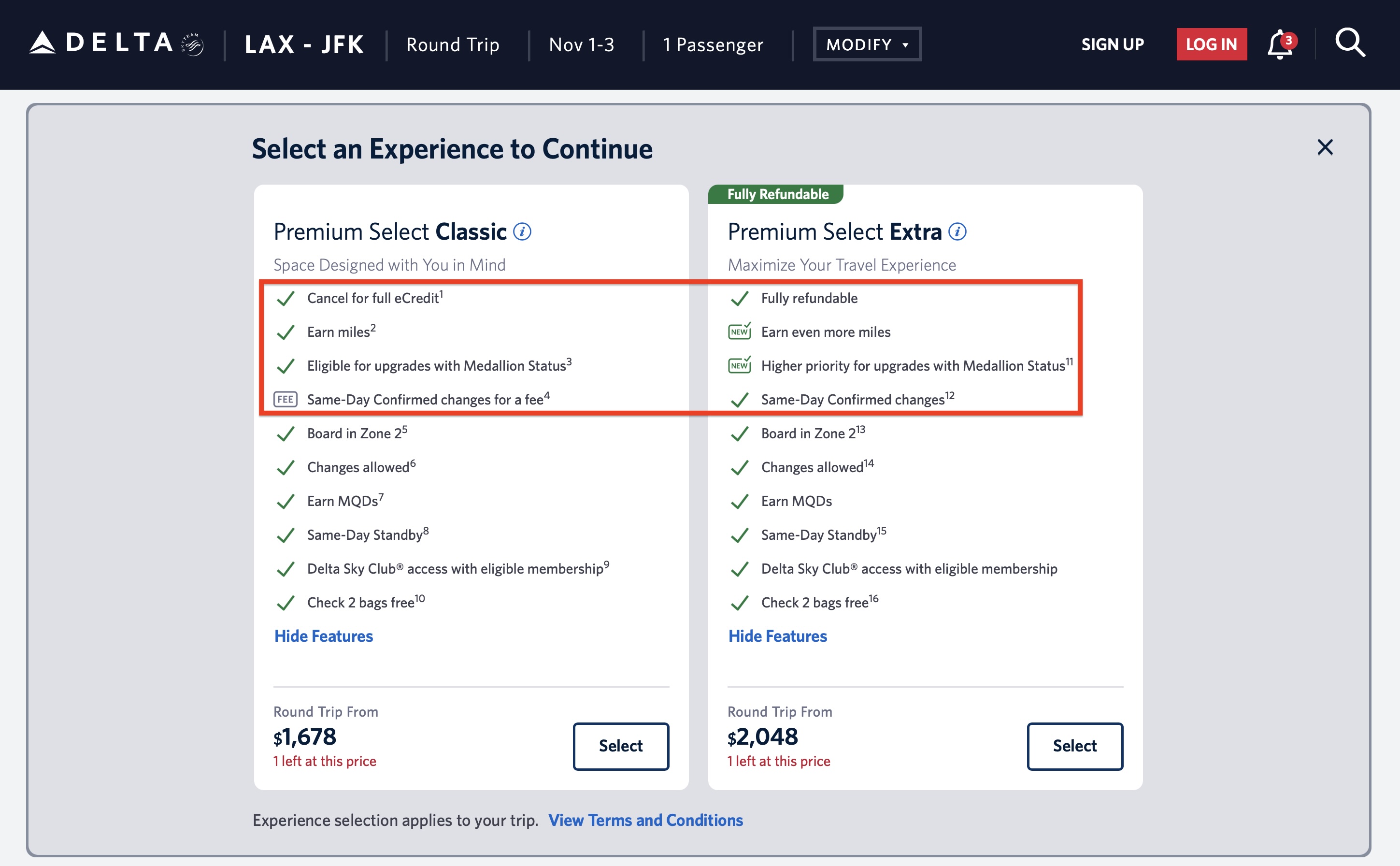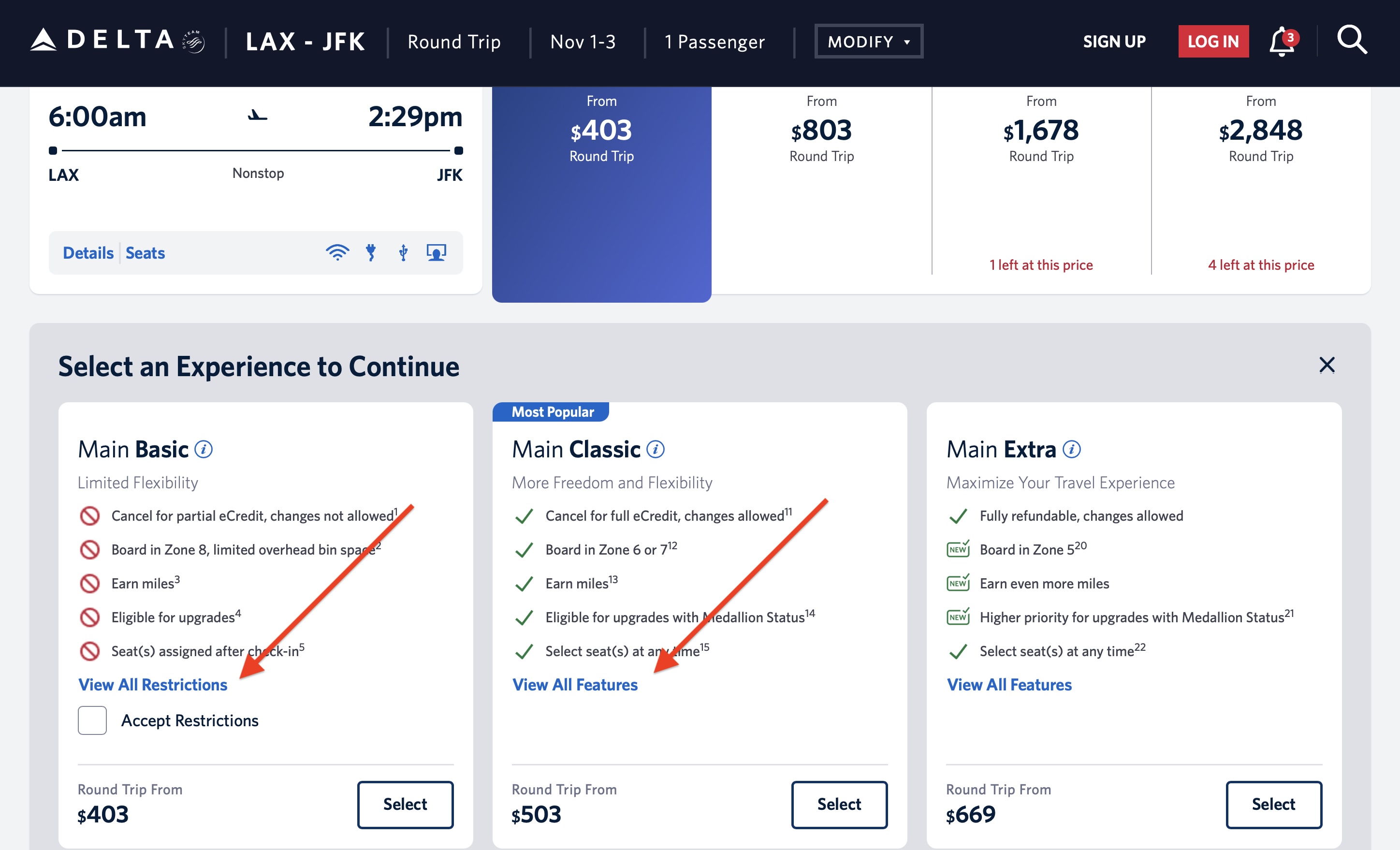 Here are examples of each new “brand” and their highlighted features. I selected a Los Angeles (LAX) to New York-Kennedy (JFK) roundtrip from November 1-3 and LAX to Minneapolis-St. Paul (MSP) roundtrip on the same dates for our examples. (There’s nothing special about these dates — they’re just random.)