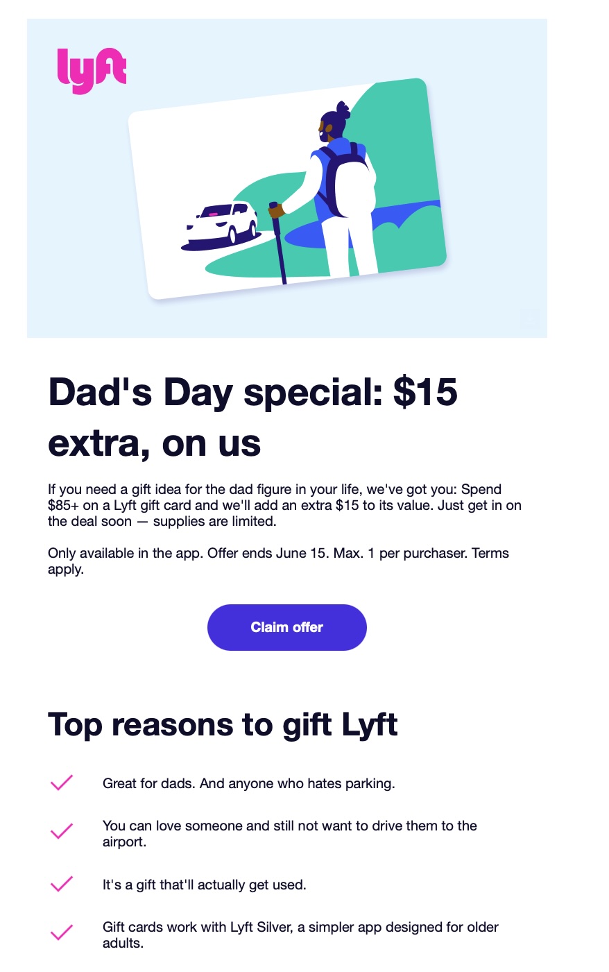A Father’s Day promotion from Lyft allows users to earn a bonus $15 on gift card purchases of $85 or more. Did you receive the offer?