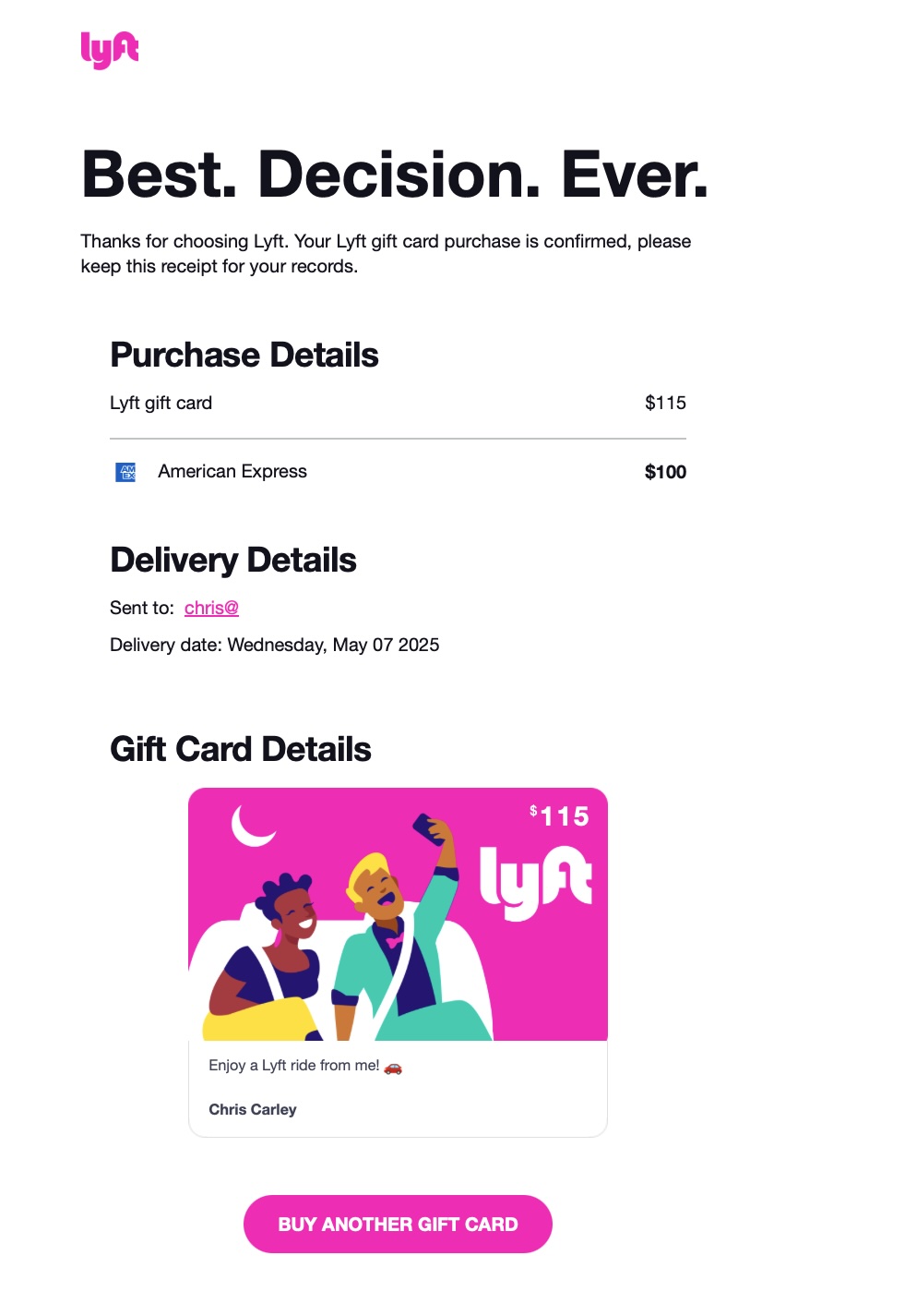 Through June 15, 2025, you can receive a $15 bonus when you spend at least $85 on a gift card purchase through Lyft. (i.e., buy $85, get $100). You can send the gift card by email or text message. You can use the offer once per account and supplies are limited. Terms apply.