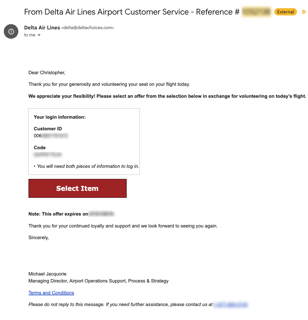 “When I looked up the flight, I do see that some passengers were given $800 DBC’s for voluntarily giving up their seat. I did not see any documentation that you were promised this DBC and when I looked further, I noted that your seat was dropped a little early in the boarding process. Normally if you are given this compensation your seat would have been dropped closer to the time of boarding. DBC’s are only given at the airport, not in reservations. For these reasons, I will not be able to give you the $800 amount in that form, however, I would like to offer you a $300 electronic transportation voucher towards a future flight. I know this is not near what you were expecting, however my hope is that this goodwill gesture will be seen as an addition to my sincere apology for this experience.”