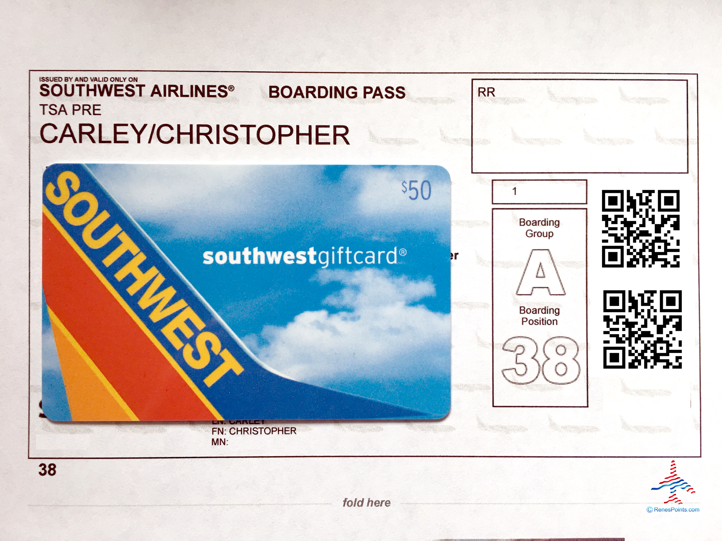 A Southwest gift card is seen stop a Southwest Airlines boarding pass.