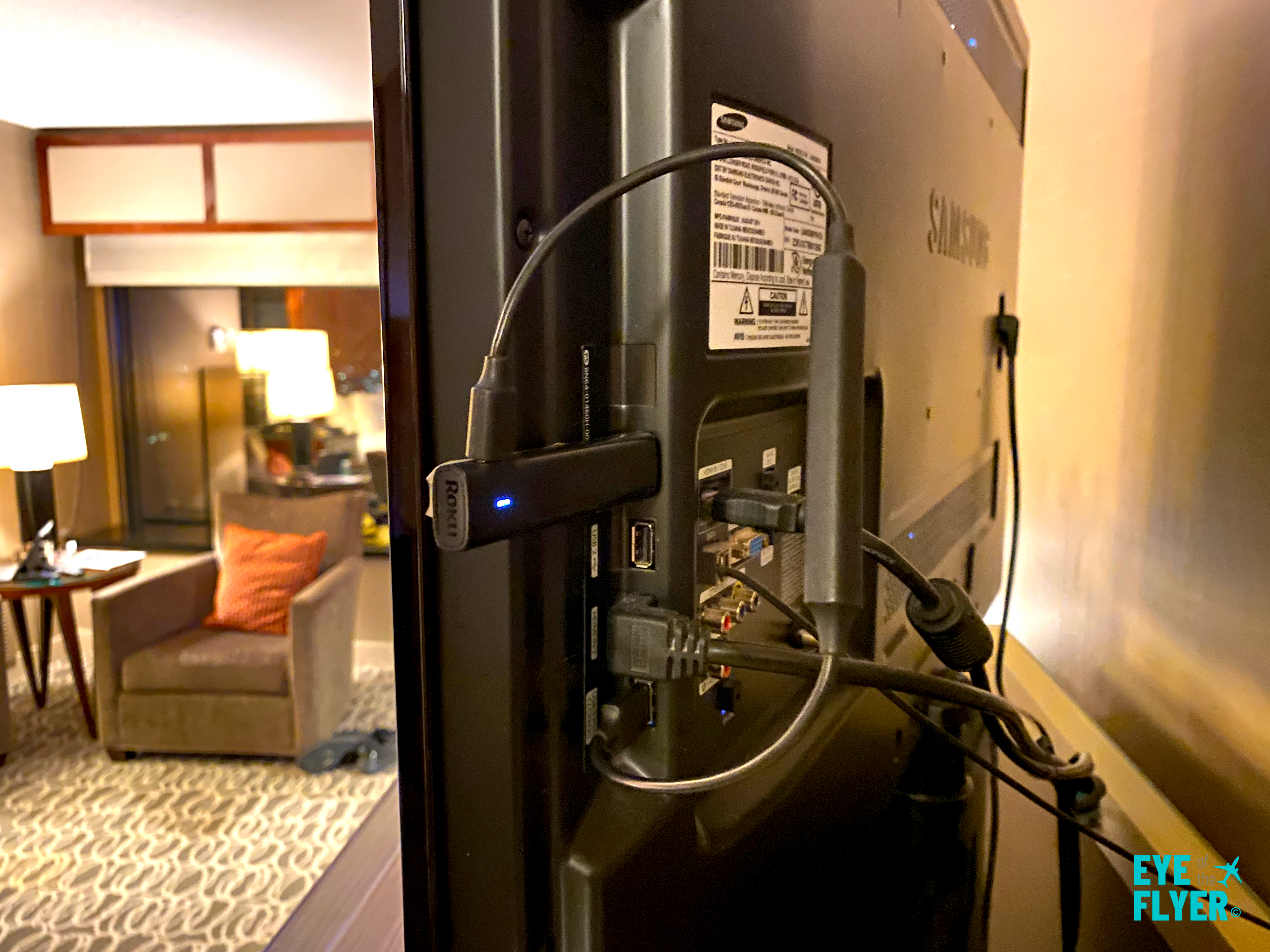 You probably noticed most hotel rooms have smart TVs with HDMI and USB ports. We bring our Roku Streaming Stick and plug it into the hotel TV.