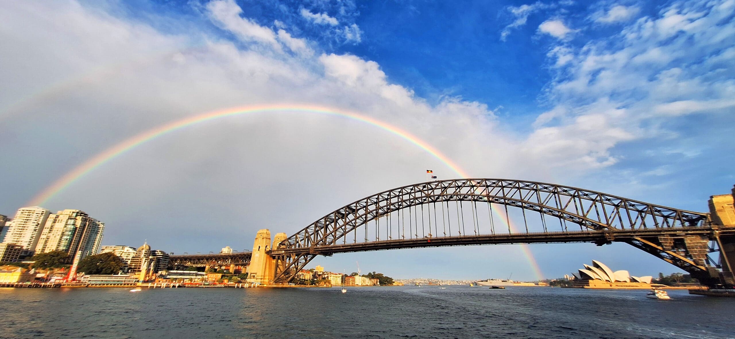 A panoramic view of Sydney Harbour featuring the Sydney Harbour Bridge and the Sydney Opera House. A vibrant rainbow arches across the sky, with a partly cloudy blue sky in the background. The water in the foreground reflects the scene, and buildings are visible along the shoreline.