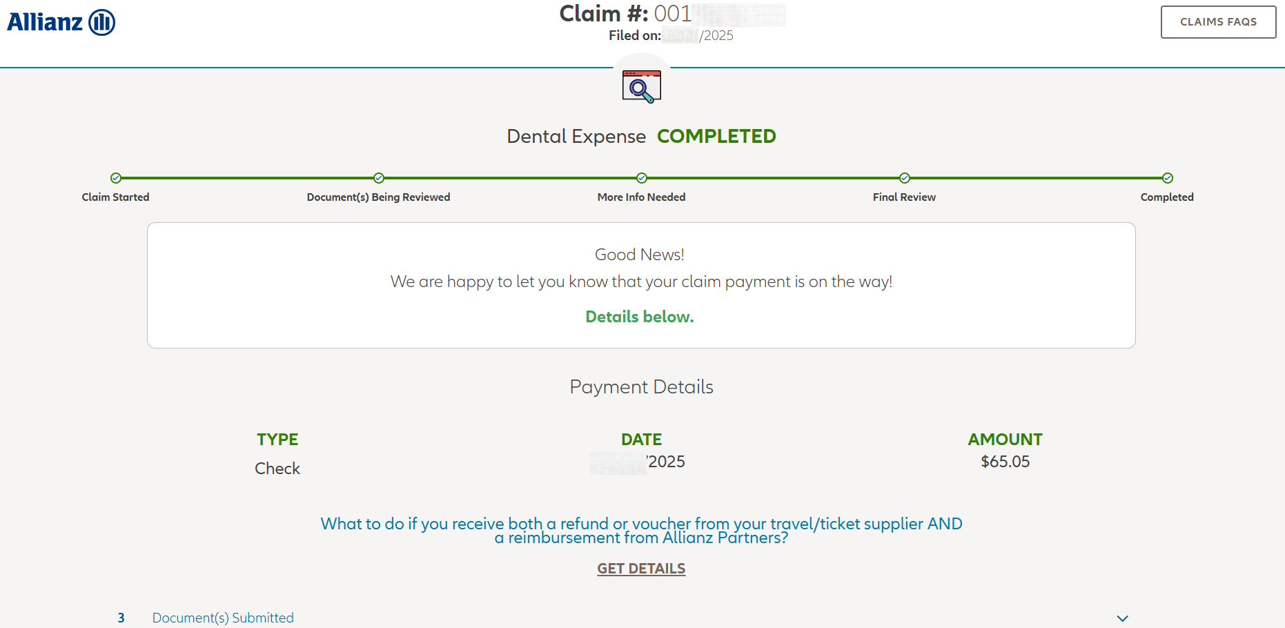 I immediately turned in a claim to my Allianz for the dental bill as well as telling them I had to pay $20 cash for the taxi ride and no receipt was provided. They only paid the for the dentist visit and I thought that was poor but not worth a fight so I let it go.
