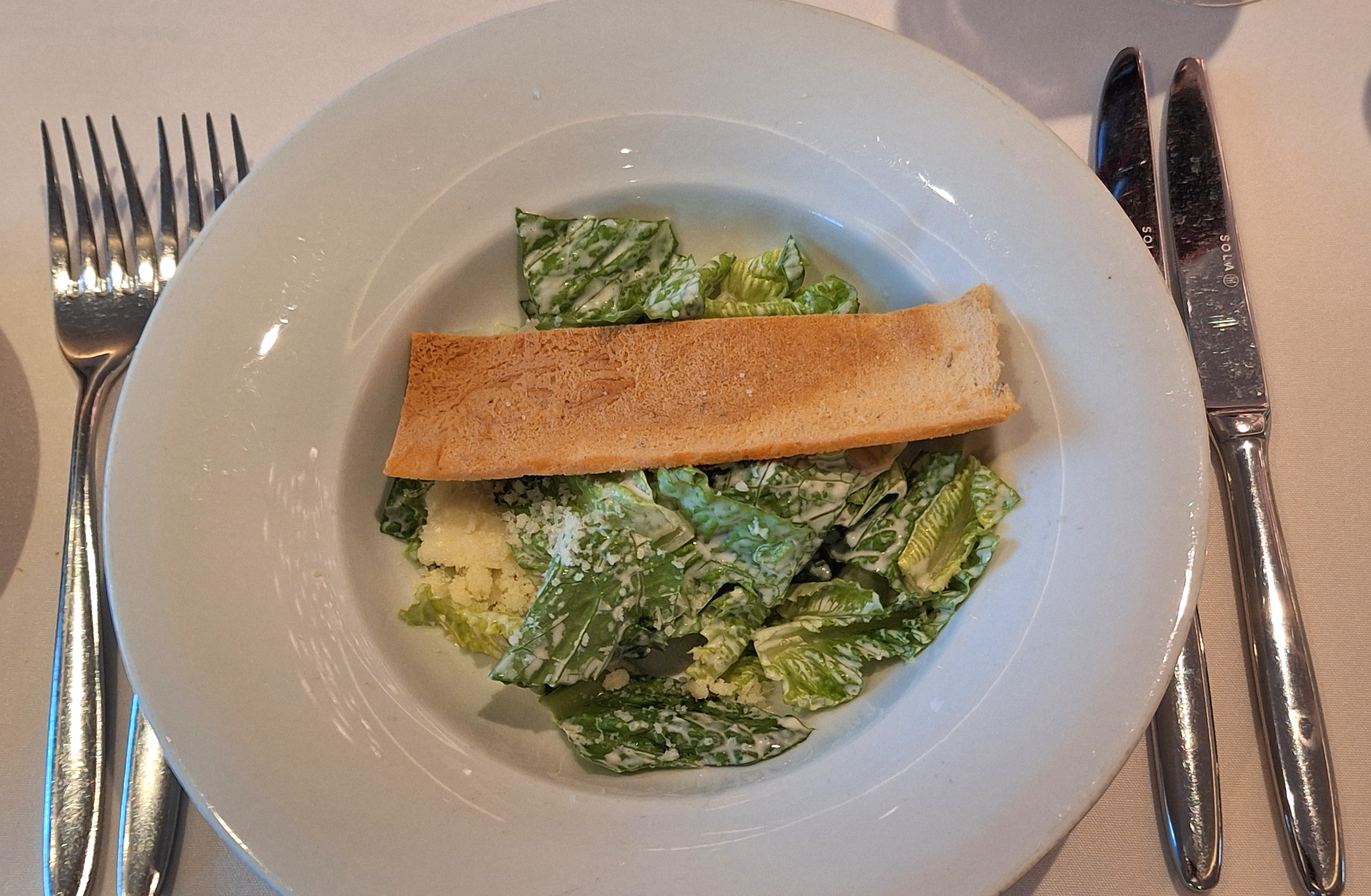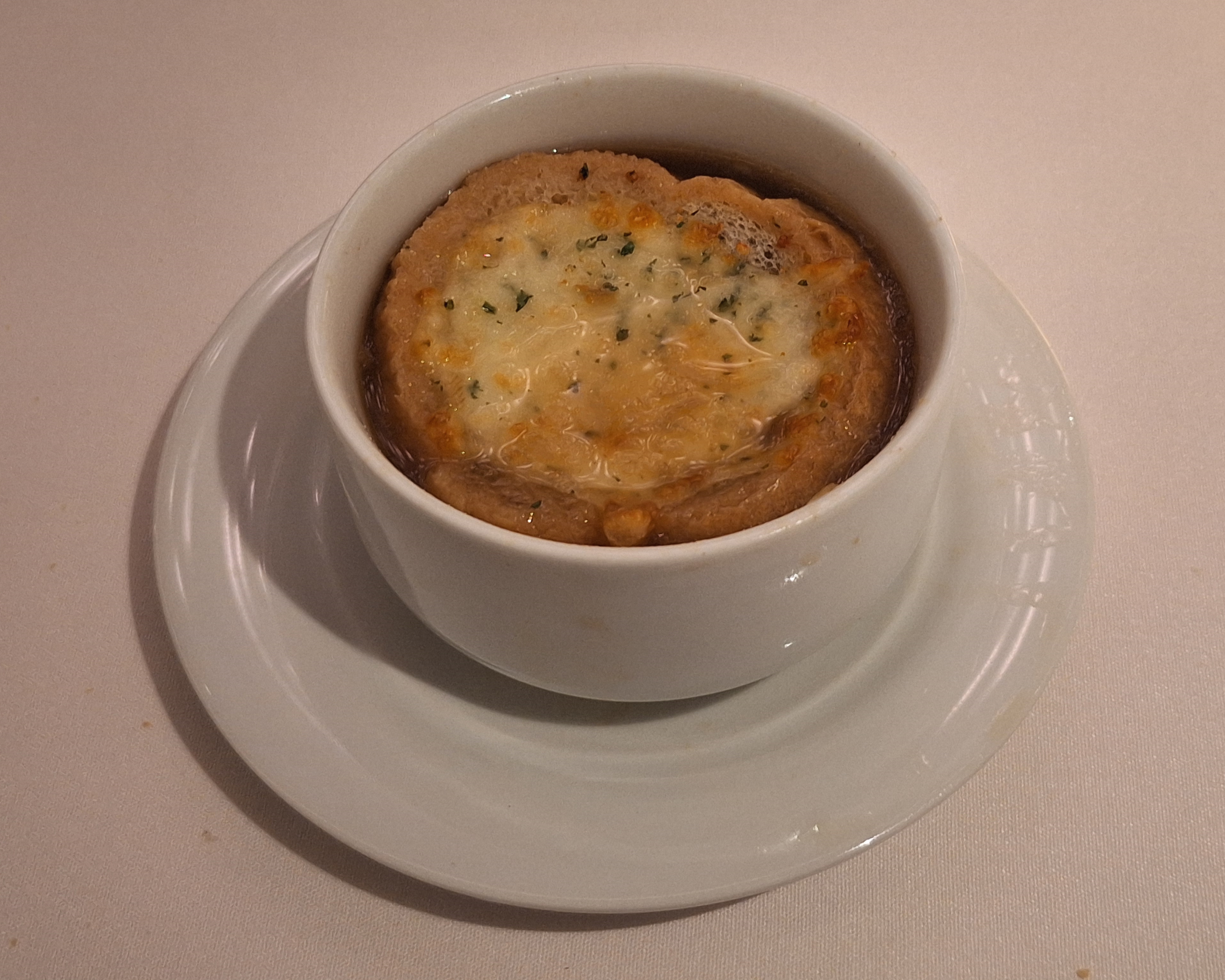 It is hard to go wrong with French onion soup and the flavor of this one is good. I do wish the bread on top was a bit thinner – a minor complain. The Caesars is fresh, crisp and lite and I love the wedge crouton on top.