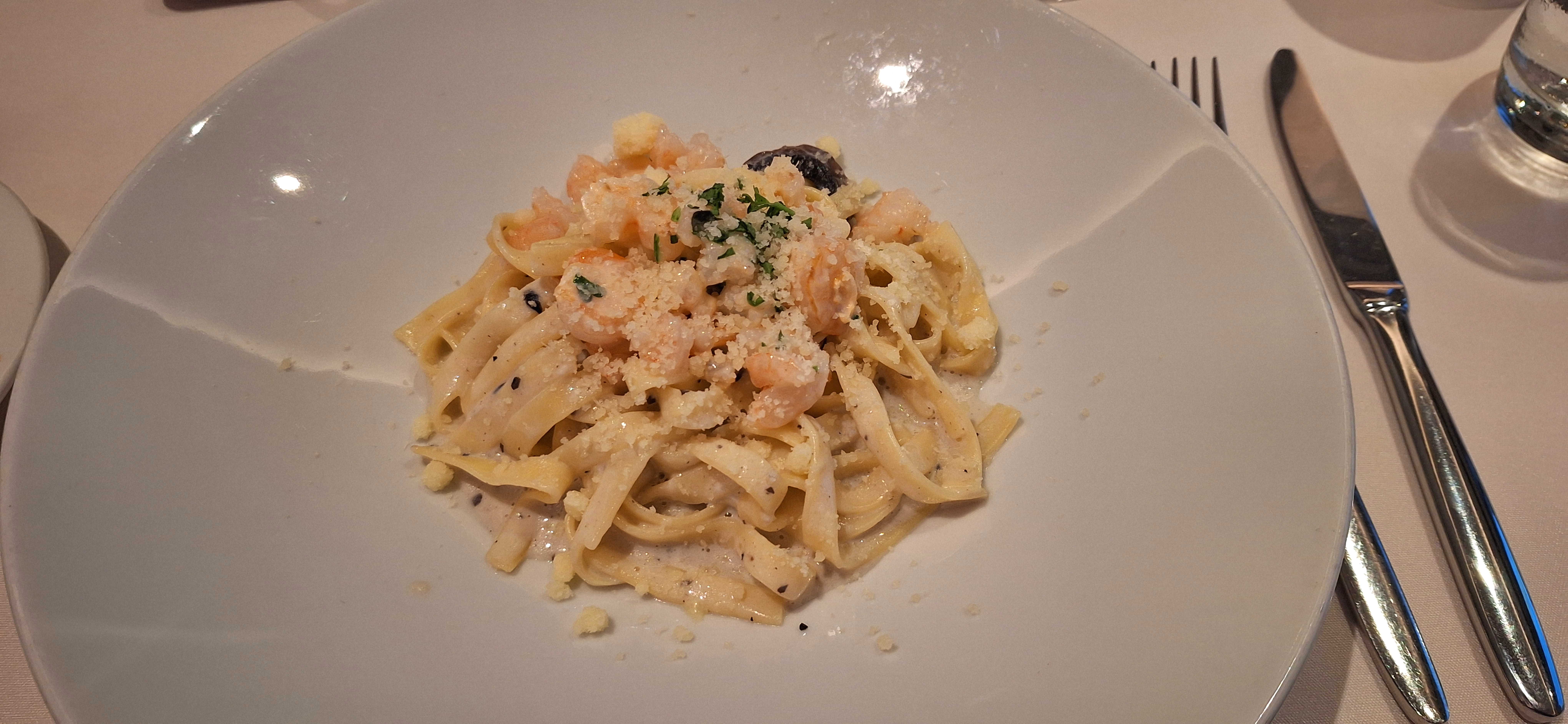 My wife is more of a fish fan than me but she really enjoyed what you see above and for me the shrimp scampi is always a winner (tip – ask for extra shrimp). Either seafood choice will leave you smiling and satisfied. For me the “stock” dinner New York strip is always a winner (compared to what MSC offers). Not only was my request for medium perfect but just look at the quality of this cut?!